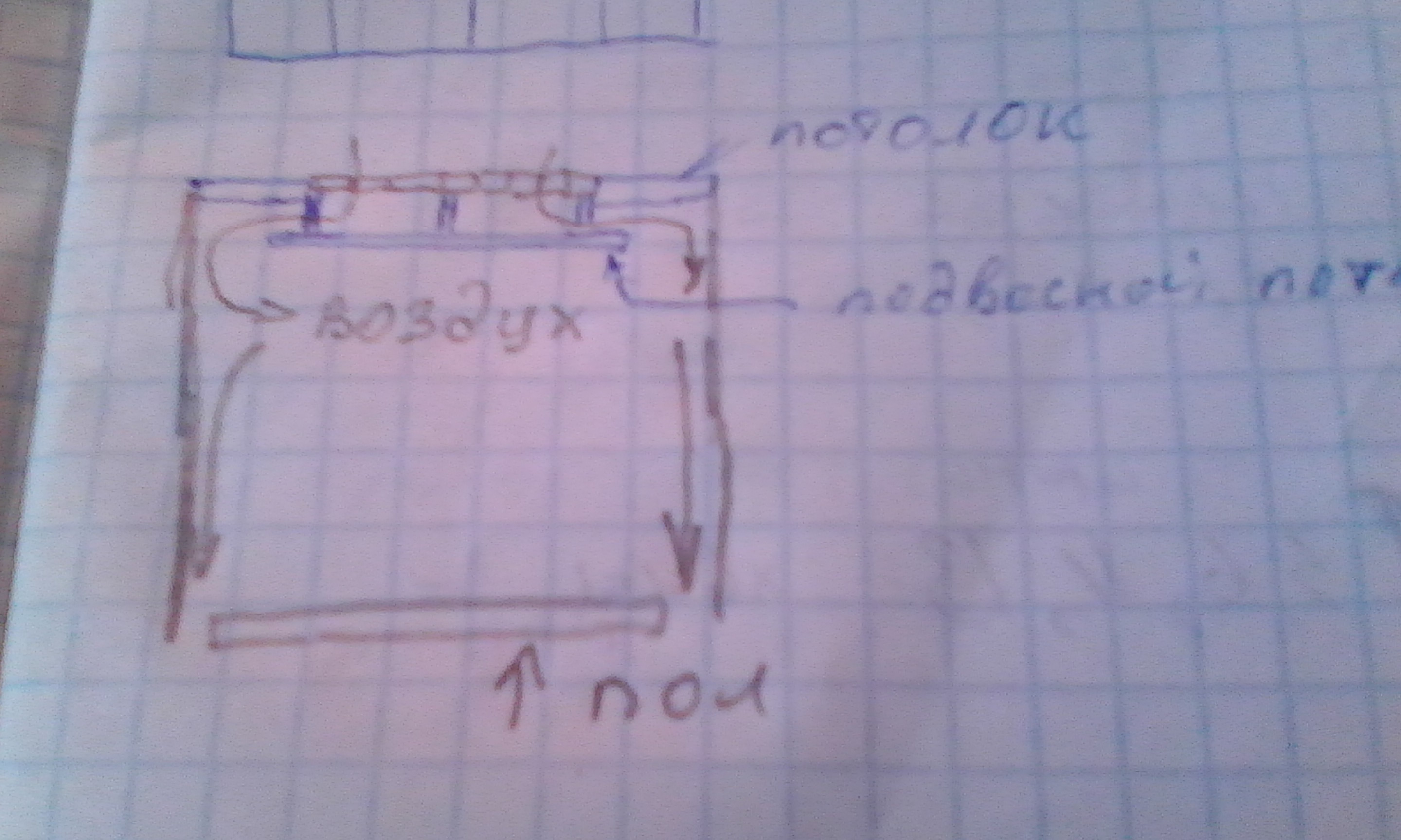 А это вид сбоку под голыми досками делаем подвесной потолок из фанеры и брусков, получается воздух легко проходит сквозь щели между досок а потом направляется вдоль стен в подпол. А опилки которые просыпаются остаются на подвесном потолке, принеоходимости можно соскрести или сделать лючок для прочистки.