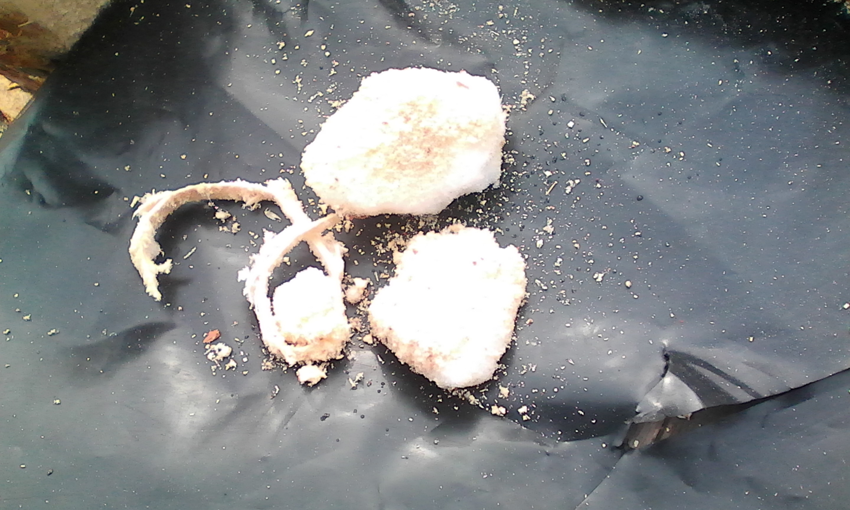 ну вот что накопал, опилки остались рассыпчатыми за исключением верхнего слоя с конденсатом и тех мест куда попадал снег. В толще опилок попадаются куски снега от погрузки и смерзшиеся куски опилок