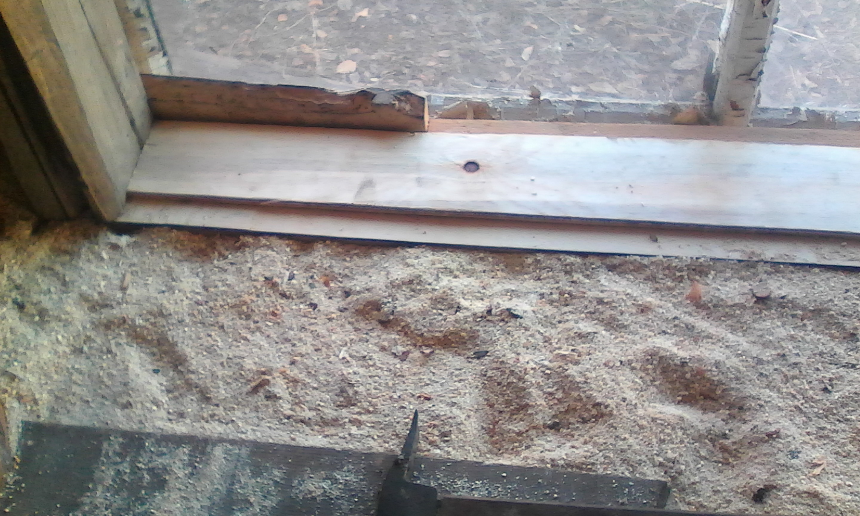 Вот вид на потолок с низу по периметру потолка зашито фанероу а середина голые доски над которыми опилки