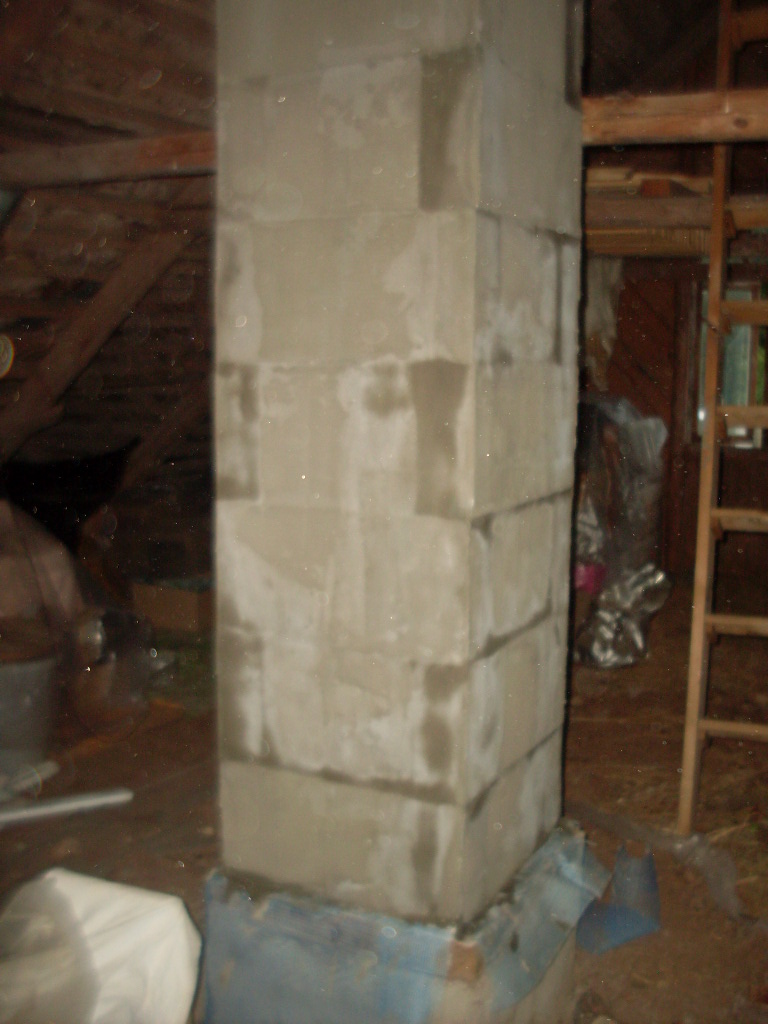 Да кто б спорил. Понадеялся на "липкость" кладочных швов. Там снизу (то, что светлее и лежит на железном "пятаке") цельный кусок блока с пробуренным круглым каналом. А сверху - 4 "кирпичика", сложенных "колодцем". Вот эдак вот: Сначала, как я понял, оно оторвалось от трёх блоков, закреплённых в потолке. Там даже щель организовалась:
