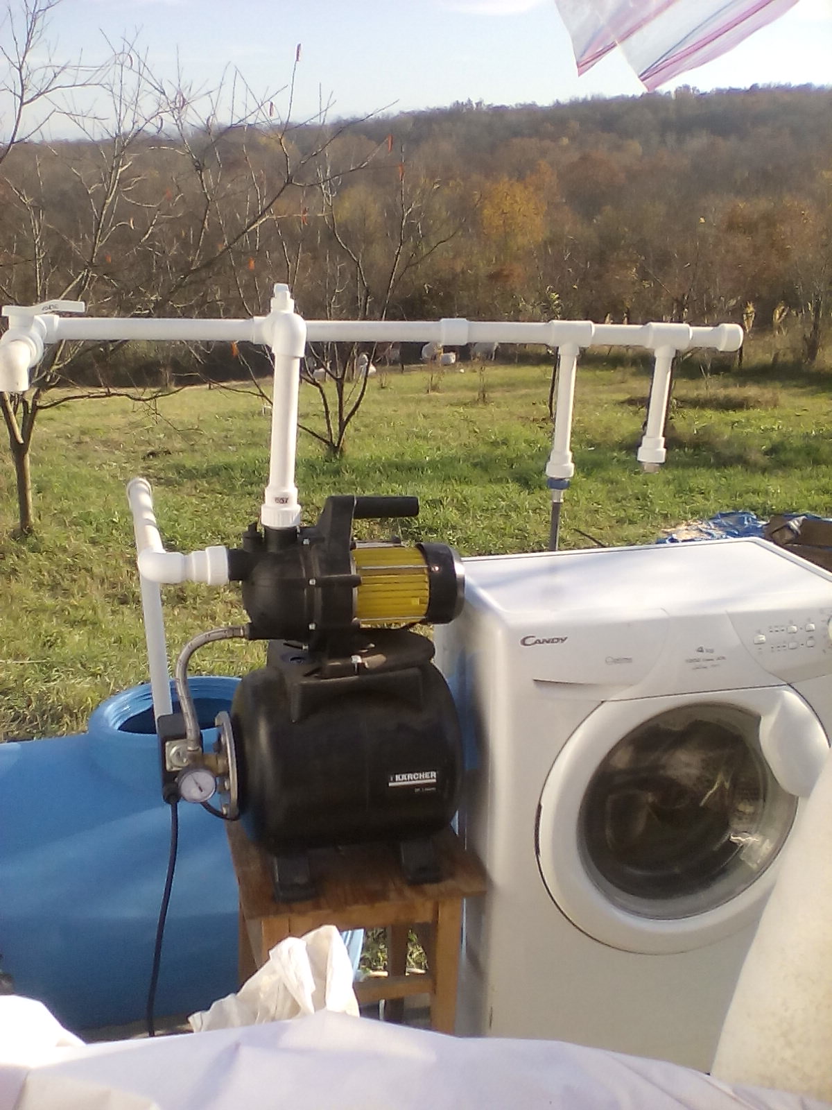 Сделала воду, поставила навес козам и отгородила кое-как им на задках, кинула туда времянку-воду. Начала теплицу. Ну и скамеечку себе построила, куда же без скамеечки! ))))