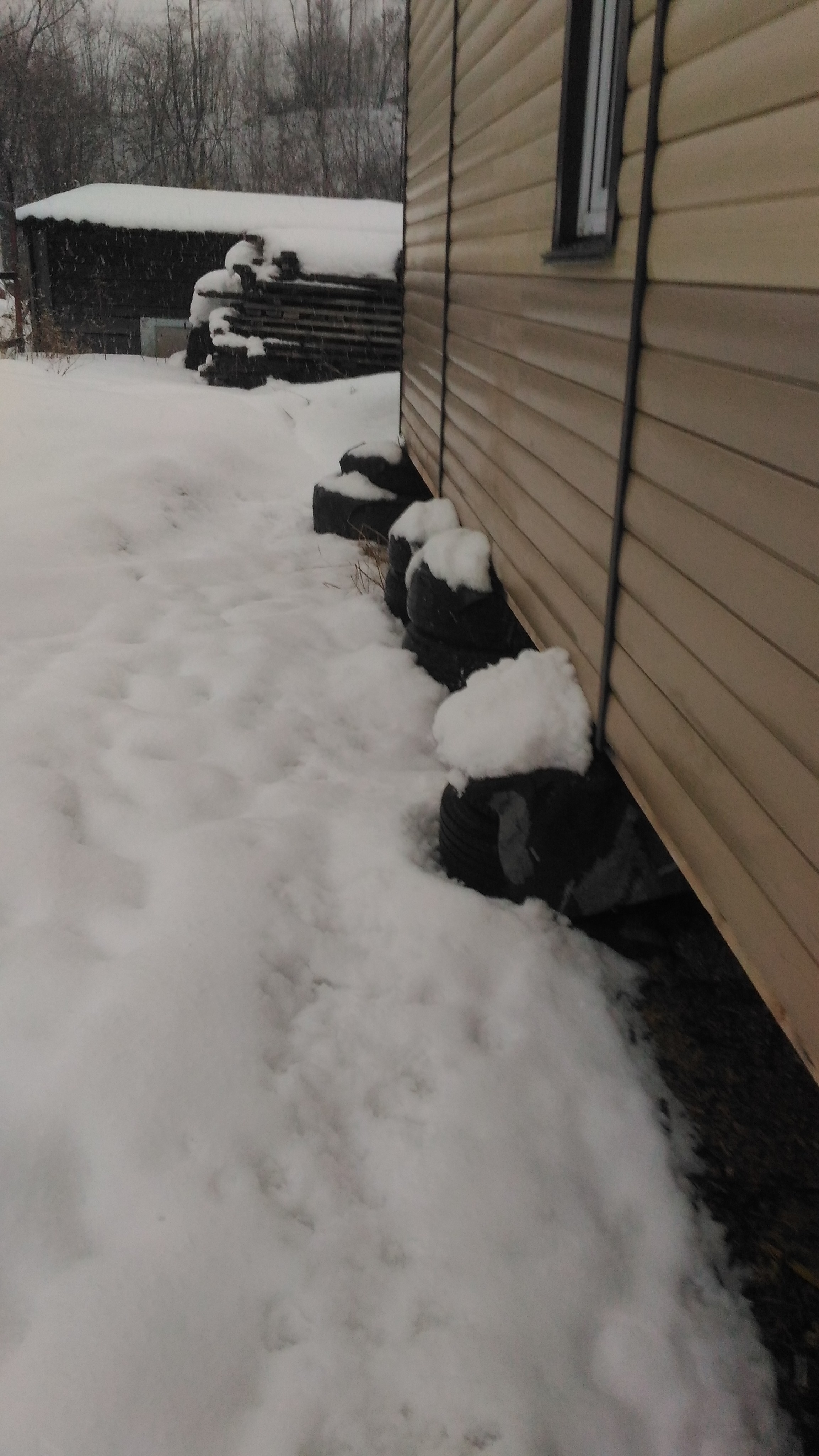 Проблема у меня(( Когда размечала фундамент, то покрышки не сместила под дом... И углы дома получились на покрышках с краю. Обвязку делали, я была на работе. Жалею о том, что не заставила переделать. Но был уже октябрь и хотела поскорее начать и закончить. Нужно было переделать обвязку. Увеличить дом. Но.. строителям было наплевать, а я не могла не работать. В общем получилась так... как получилось. Опять же .. прошу учесть, что я одна строю и это мой первый дом)) Теперь думаю, как закрыть эту порнографию.. По углам дома и по середине лежат покрышки от Камаза, а на них стопкой легковые.