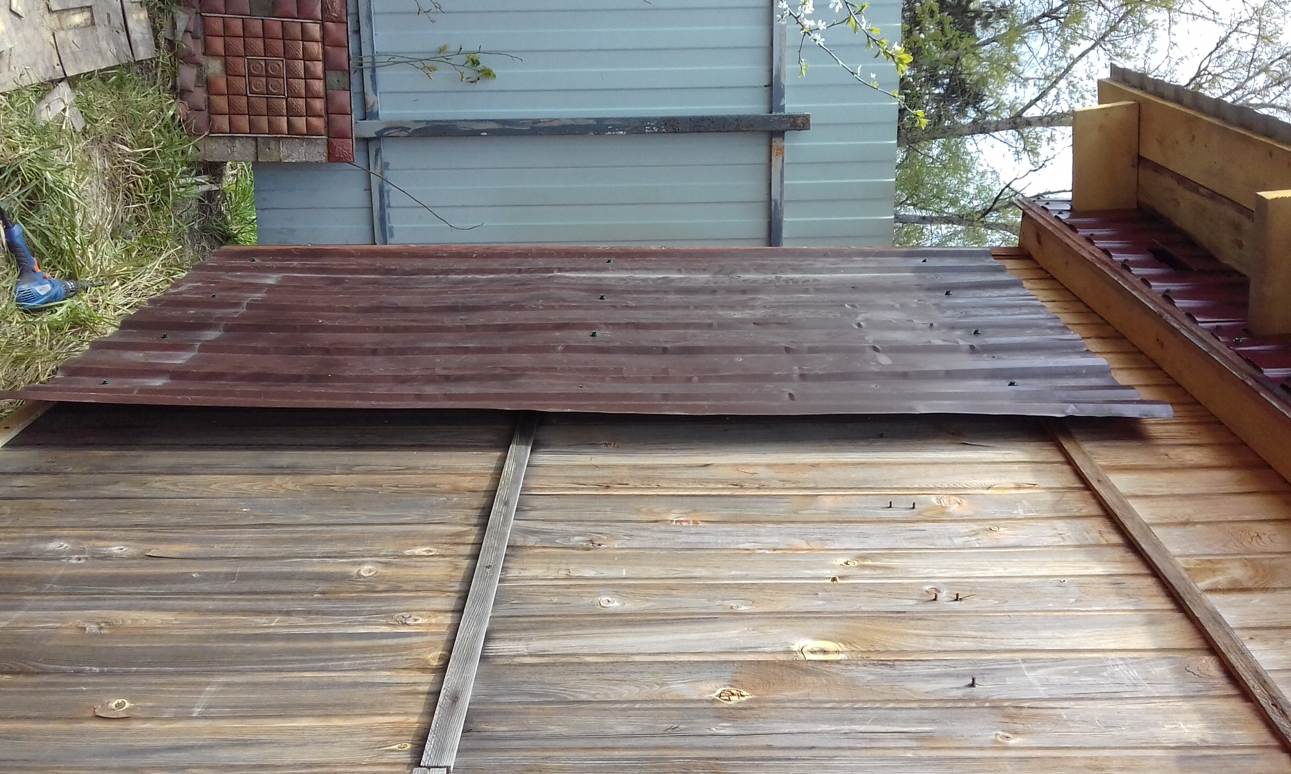 Снятые с кровли бытовки листы профнастила пустил на обшивку стен бытовки.