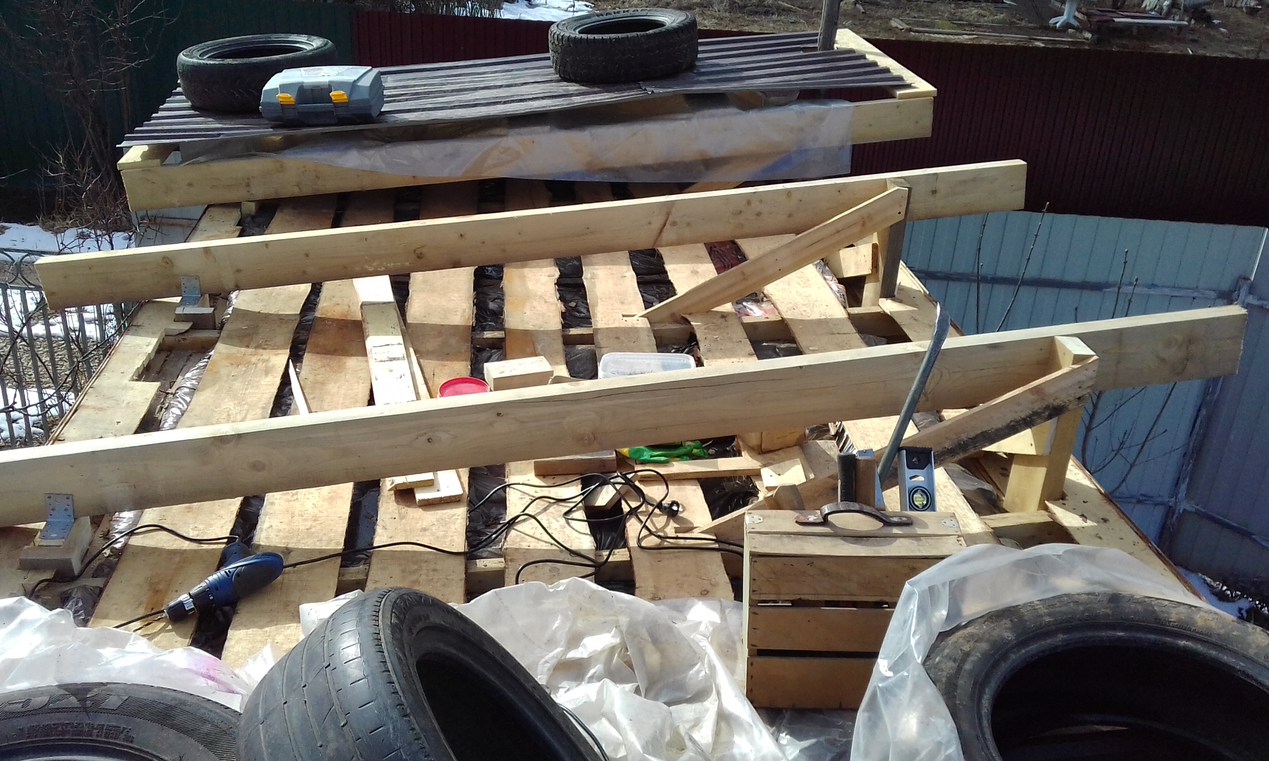 Дим, был скат 5 см на 2.3 м. Сейчас установил две стропилы длиной 3 м под углом 10 градусов. Ну и если бы не возврат зимы, дальше бы гнал.