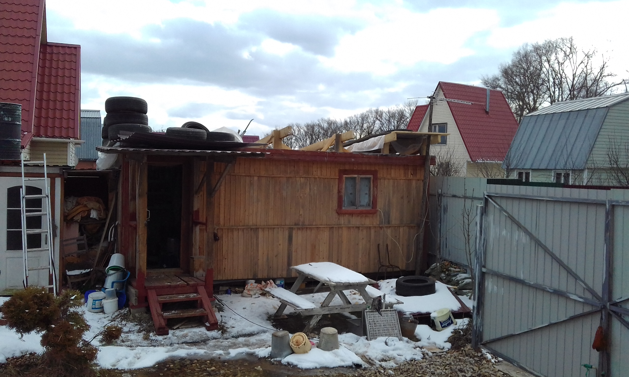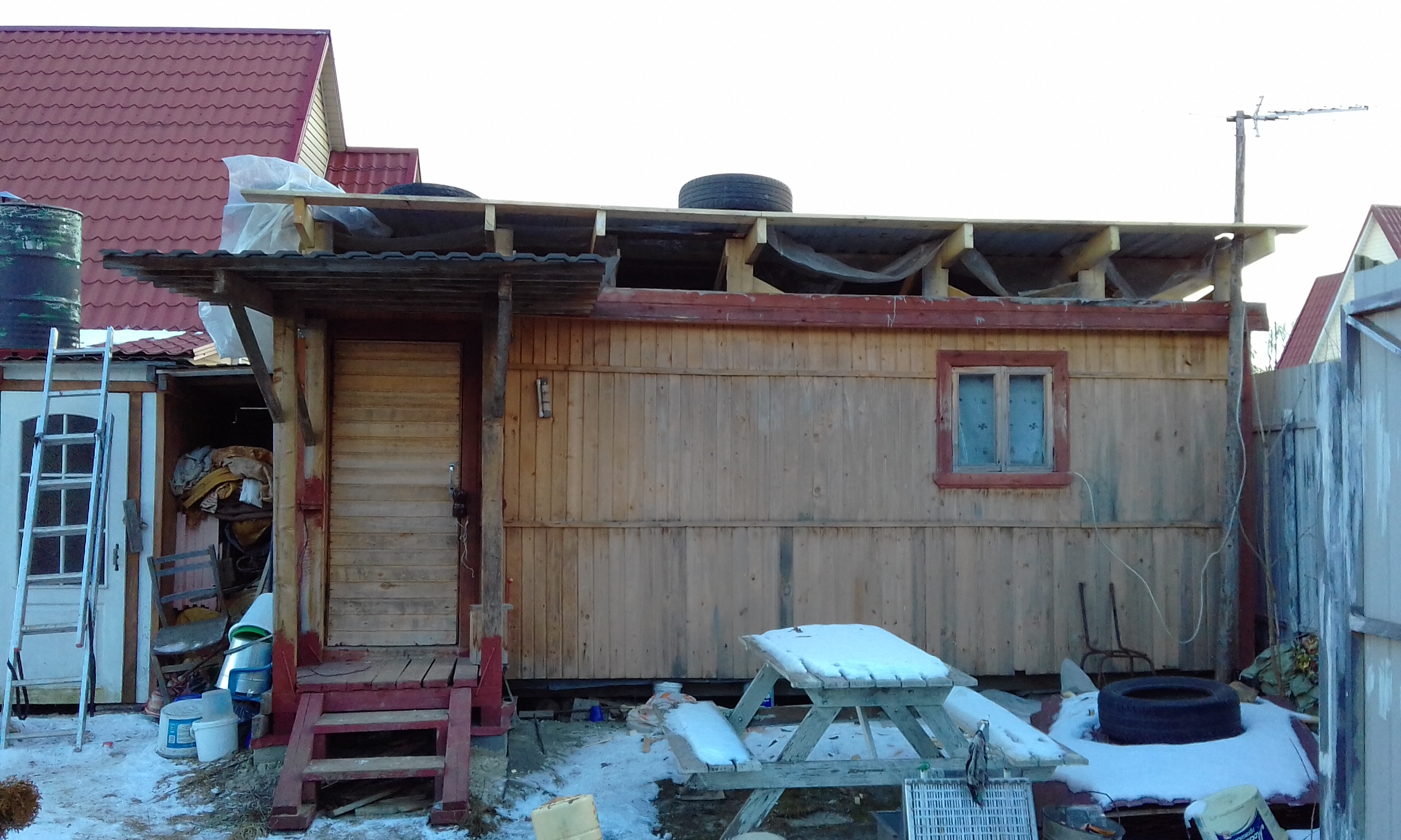 Купил наплавляйку. Сейчас снег сошел, и ливни были - вроде не протекает, поэтому сначала всё-таки возьмусь за стены, а потом за кровлю.