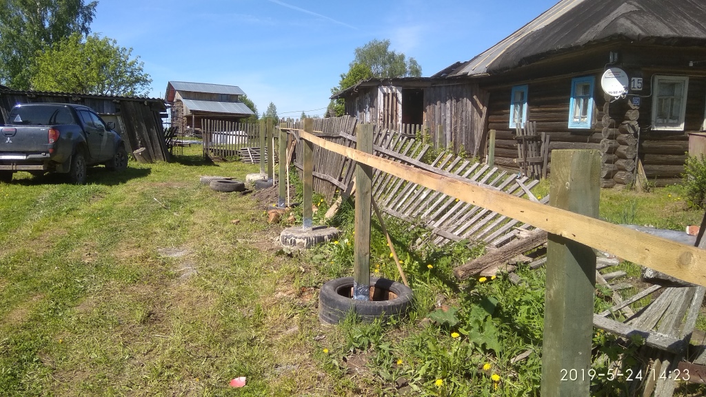 2. Когда новый забор должен отстоять от старого на определенном расстоянии, то один брусок соединяет старый забор со столбом нового, а второй ставится распоркой как в первом случае: 3. Ну и если новый забор ставится туда же, куда и старый, то я выпиливал штакетник снизу, ставил и бутил там покрышку, а брус крепил к старым прожилинам, отрывая мешающую установить столбик штакетину Таким способом легче делать забор постадийно, просто обрезая прожилину перед местом крепления:
