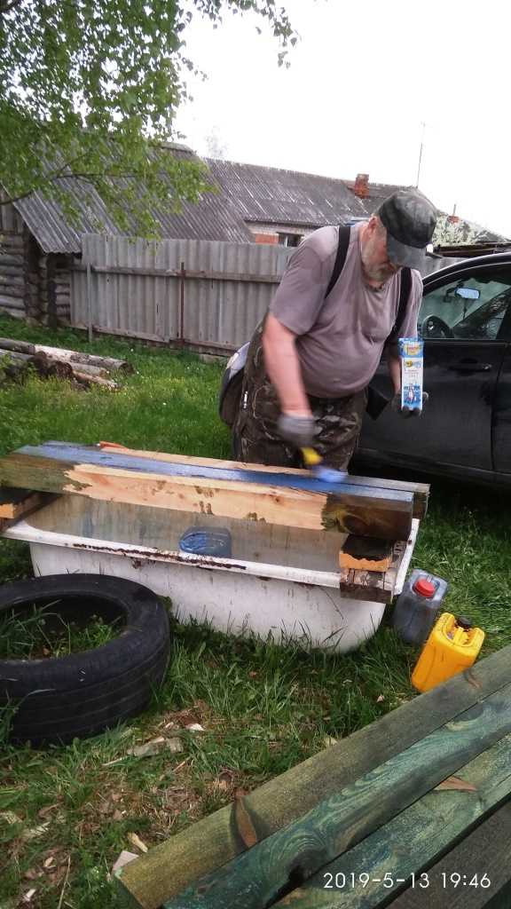 Надо понимать, что брус -это сердцевина дерева и антисептирование необходимо, поэтому оба торца пропитал на заднем дворе окунанием в обрезки 5 и10 л.канистр от воды. Сначала в Биосепт для очень влажной среды, потом в Неомид 430. Вещи хорошие и мной проверенные, но дорогие.