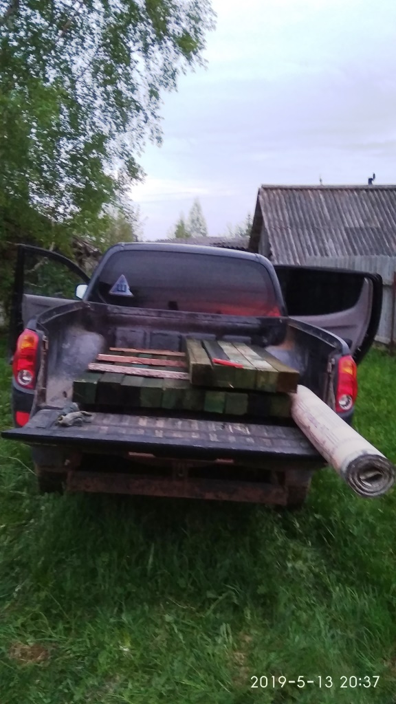 Так, теперь про материалы: Начну со столбов. Купил на пилораме 5 шестиметровых сухих брусьев 100х100 и 4 поддона по 100 руб для дров, отдав за это 2 круб. Брусья поделил на 4 части, загрузил в машину и увез. Самое интересное: искал брусья 3 дня-пилят только под заказ и потому в деревню вез из райцентра за 40 км.