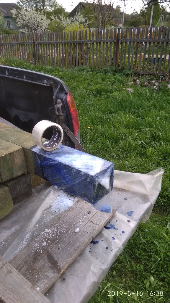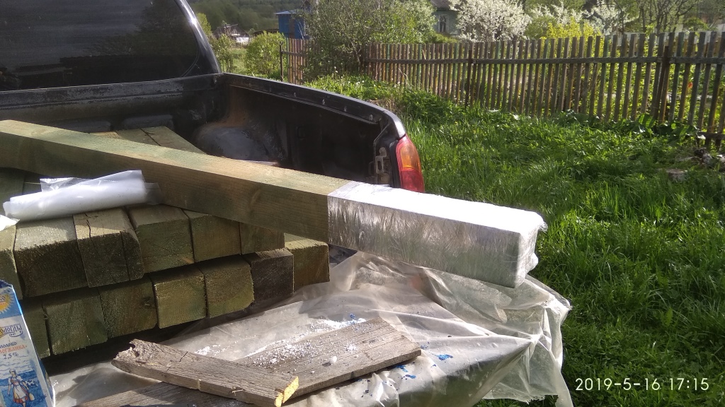 Теперь важное: Дополнительно был антисептирован и подготовлен край столба, который будет в бетоне: работу производил прямо в кузове , накрыв крышку пленкой, чтобы сто раз не перегружать. Край был обмазан концентрированным Неомидом и густо посыпан солью включая торец после сего слоев в 5-6 замотан стрейдж (упаковочной) пленкой и скотчем. В результате организовался стакан выше уровня бетона. При обмазке фундамента битумом стакан из пленки можно будет срезать по линии заделки в бетон, который дал некоторый зазор на случай разбухания древесины и замерзания влаги. К тому же вода растворит соль и Неомид и дерево законсервируется еще глубже. В сслучае, если столб перегниет его легко можно будет вынуть и заменить, но надеюсь, что лет 10-15 постоит.