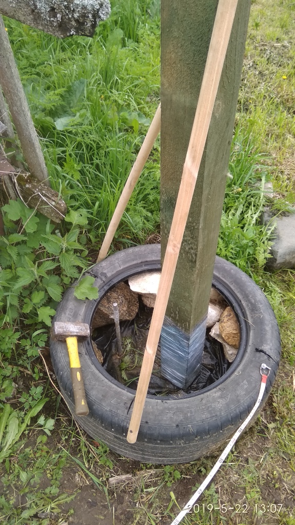 2. Покрышки выставляются на грунт со снятой плодородкой примерно в горизонте-сильно морочиться не стоит- важно как встанет столб, а если покрышка будет чуть под наклоном. то и не хуже. Будет куда воде стекать.