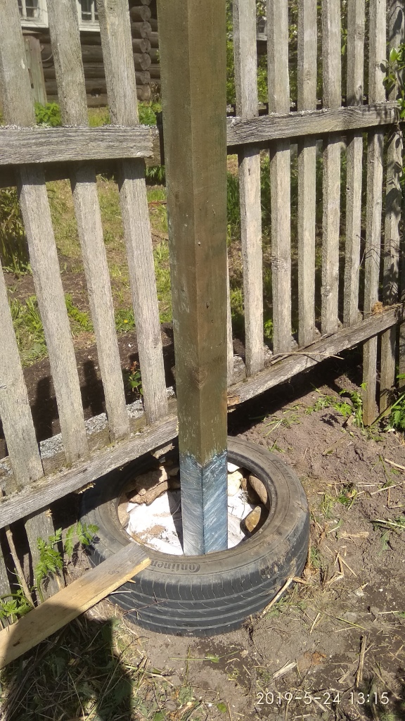 Ну и еще один момент на сегодня: как крепить столбик к покрышке. Во-первых крепится он когда покрышка забита бутом. Я Нашел три способа, кроме описанного выше: