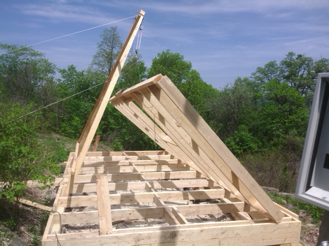 Дим, а низ треугольной стрелы "крана" ты гвоздями шарнирно крепил к половым лагам? И "стрела" поднималась вместе со стеной?