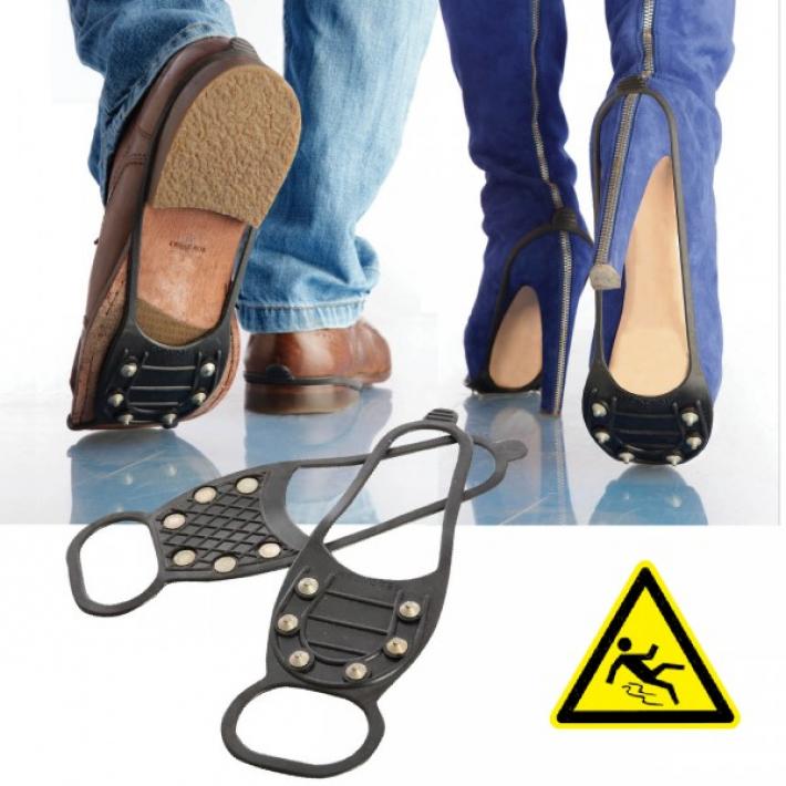 Бнрутся старые мужнены поулеретановые тапки. Разрезается пополам верх. Накручиваются короткие саморезы с большой шляпкой в подошву изнутри. А в верхнею часть зашнуровать под обычную обувь. В гололёд быстро сунул ногу в такой тапок, дошёл куда нужно и скинул с сапог.