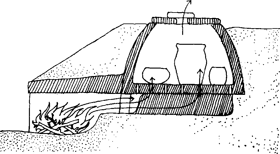 Интересна сама конструкция аркаимской печи. В ней при совмещении очага и колодца создавалась естественная и сильная воздушная тяга. Воздух, поступающий в столб колодца (на иллюстрации ниже), охлаждался расположенной в столбе колодца водой и поступал в топку. Известно, что для плавления бронзы необходима достаточно высокая температура, которую невозможно получить без подачи большого объема воздуха к месту горения.