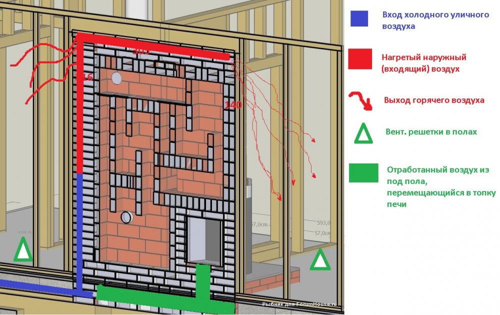 Наружный воздух - греется в канале , который примыкает к печи.