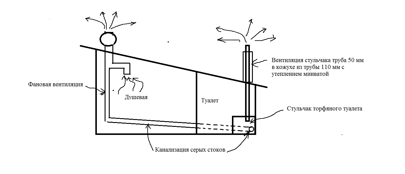 Схемка вентиляции пристройки (душевая и туалет). Воздуховоды из серых канализационных труб 50 мм и 110 мм.