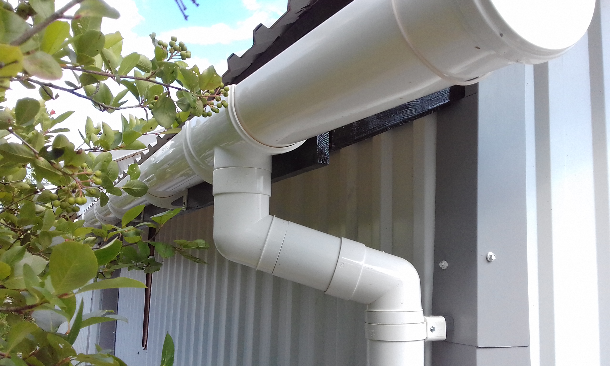 Установил пластиковую водосточную систему на пристройку. Хорошо смотрится. Но к сожалению она с тыла пристройки - не часто можно ей полюбоваться. :) Немецкое качество однако.