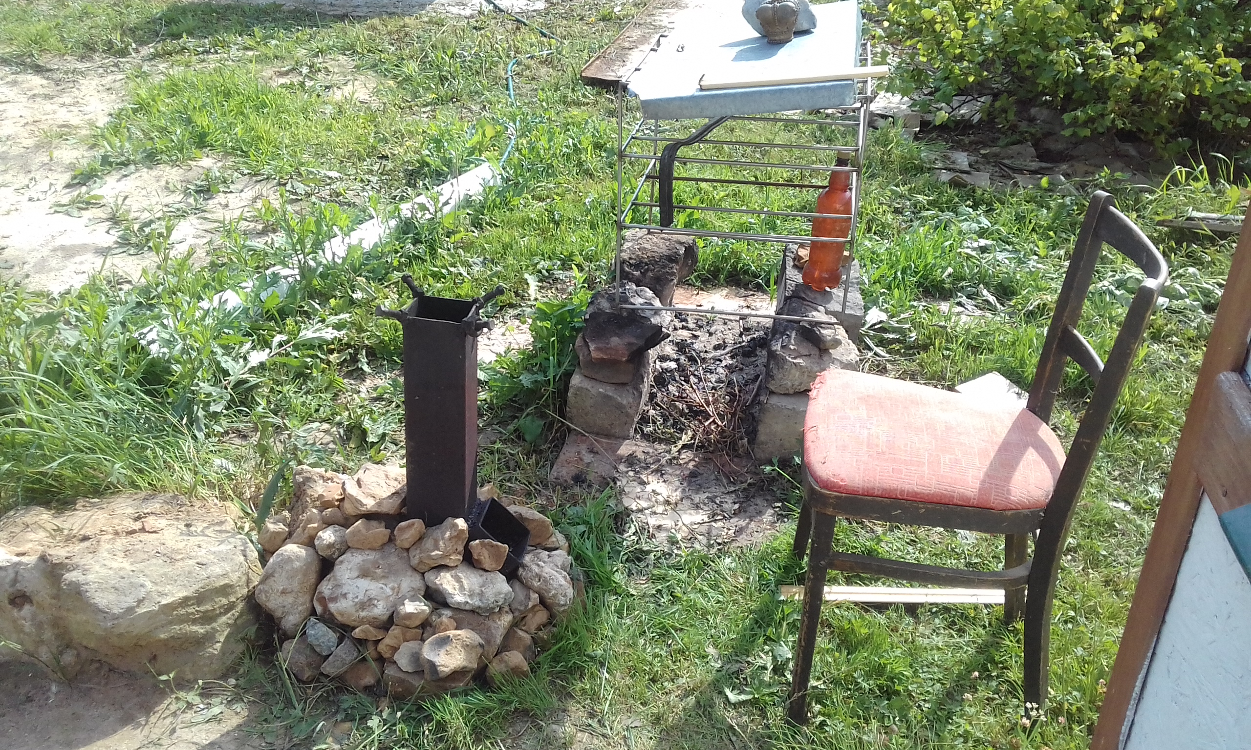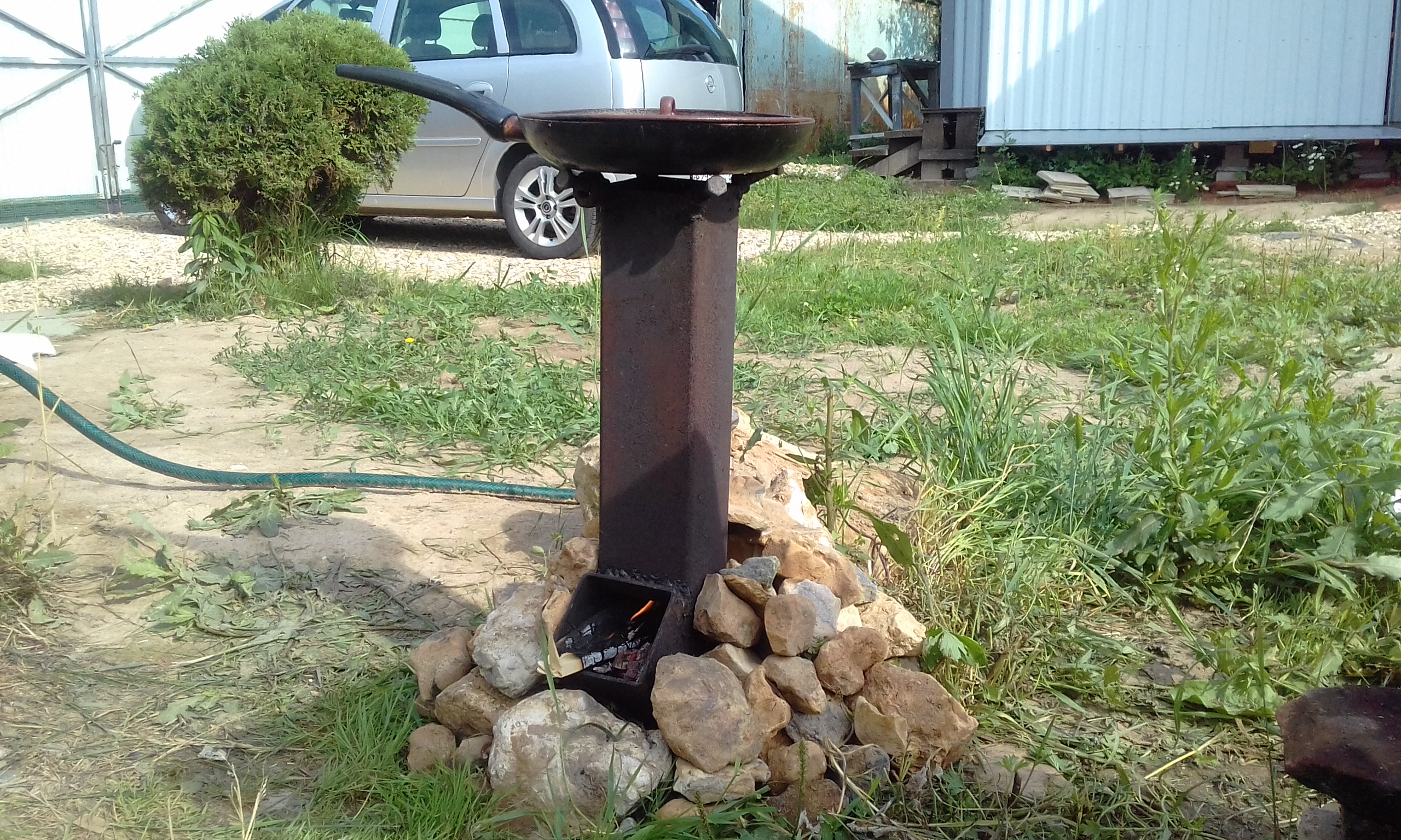 Перед отъездом открутил редуктор от стационарной газовой плиты и прикрутил к походной (собираемся в поездку всей семьёй). Очень пригодилась ракетная печь, сваренная в прошлом году. Камни её, по-моему, очень украсили.