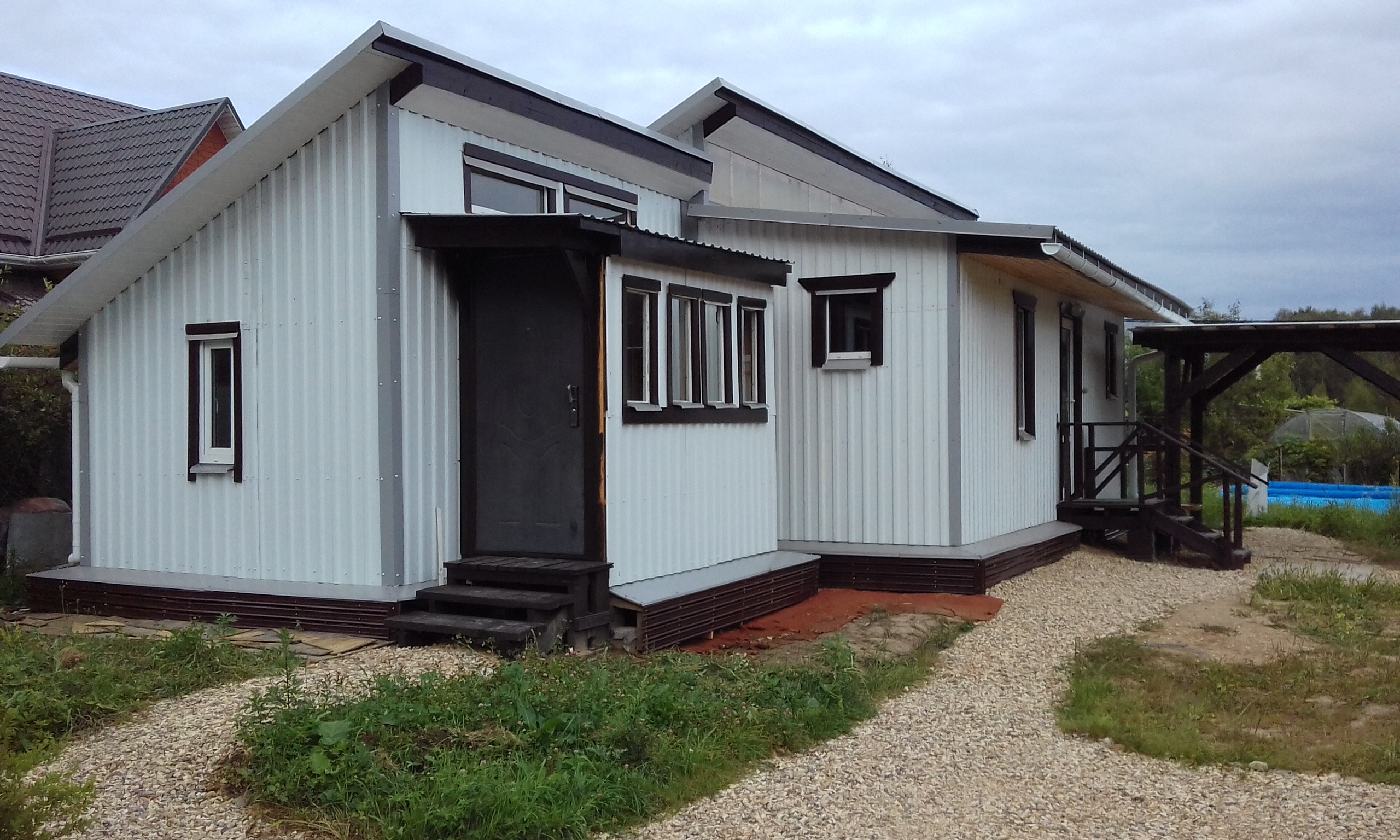 Экспериментально облицевал цоколь с торцовой части мет. штакетником 76х1800 мм по 86 руб. за штуку. Между штакетником зазор в 15 мм для вентиляции подполья.