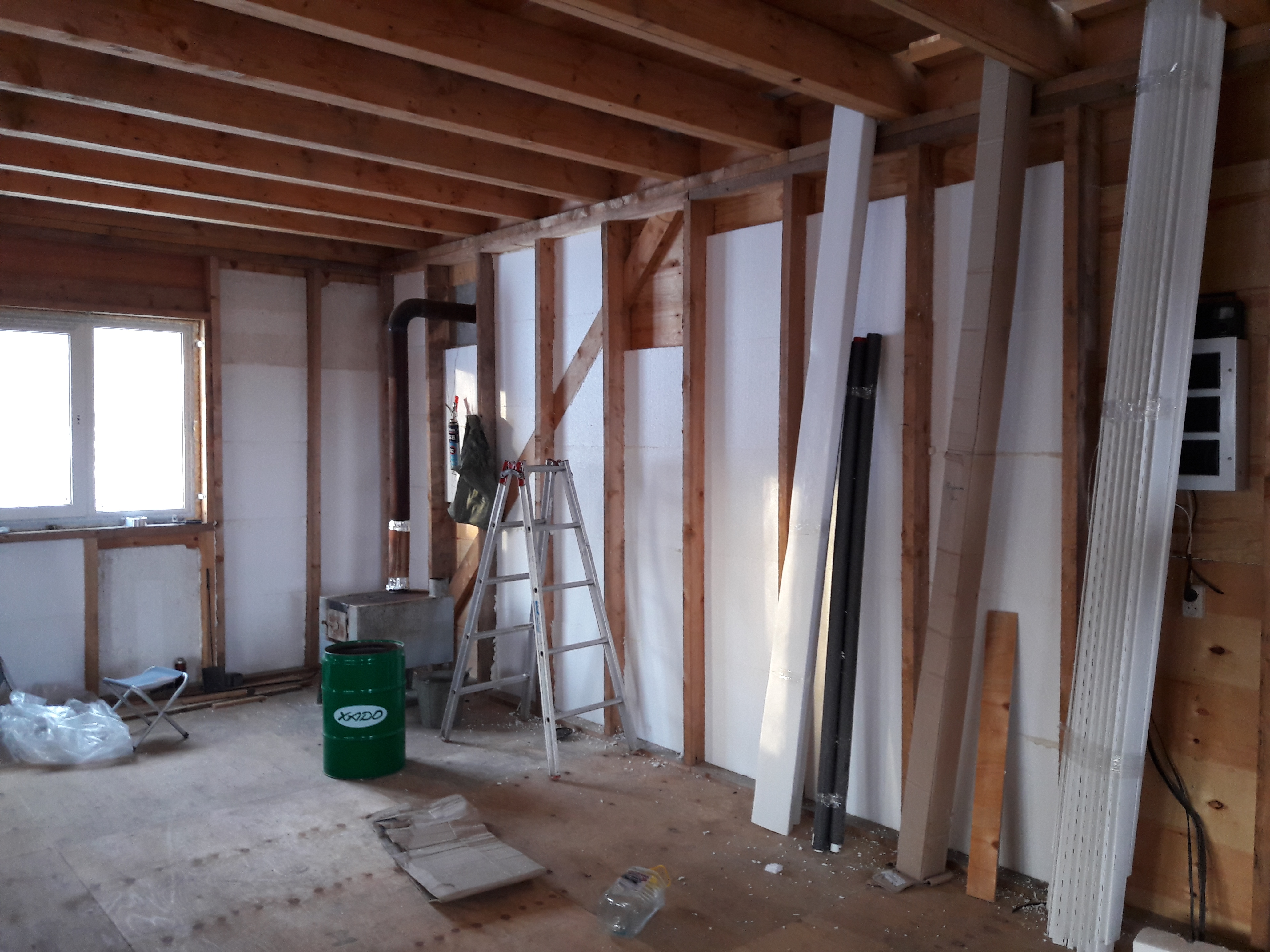 Где-то половина первого этажа в первый слой положил в стены. Если по нормальному то сначала бы полы утеплить. Но это надо подпол лезть, а там холодно чото