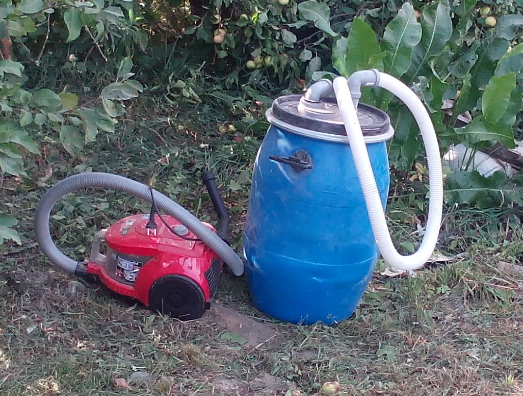 Дима, я сделал из 40-50 канальных труб, Москвичевского фильтра и 60л пластиковой бочки. Источником вакуума является бытовой пылесос. Минуса два: свист такой, что обезьяны в панике разбегаются и бочку в кучу пару раз сложило-пришлось вставлять обручи из ПВХ труб для жесткости, ну и таскать запаришься-надо ставить всю приблуду на одноосную тележку бабушки