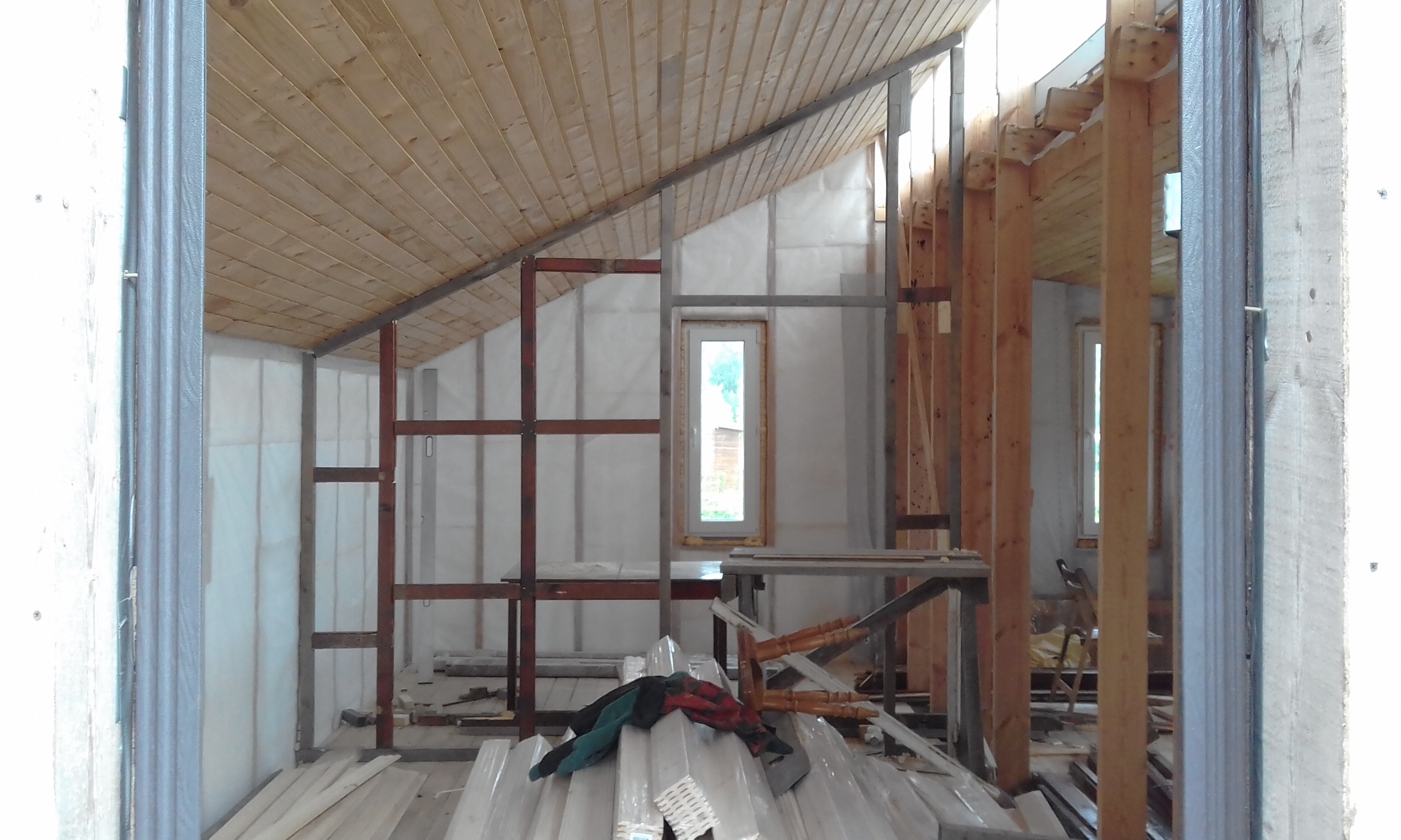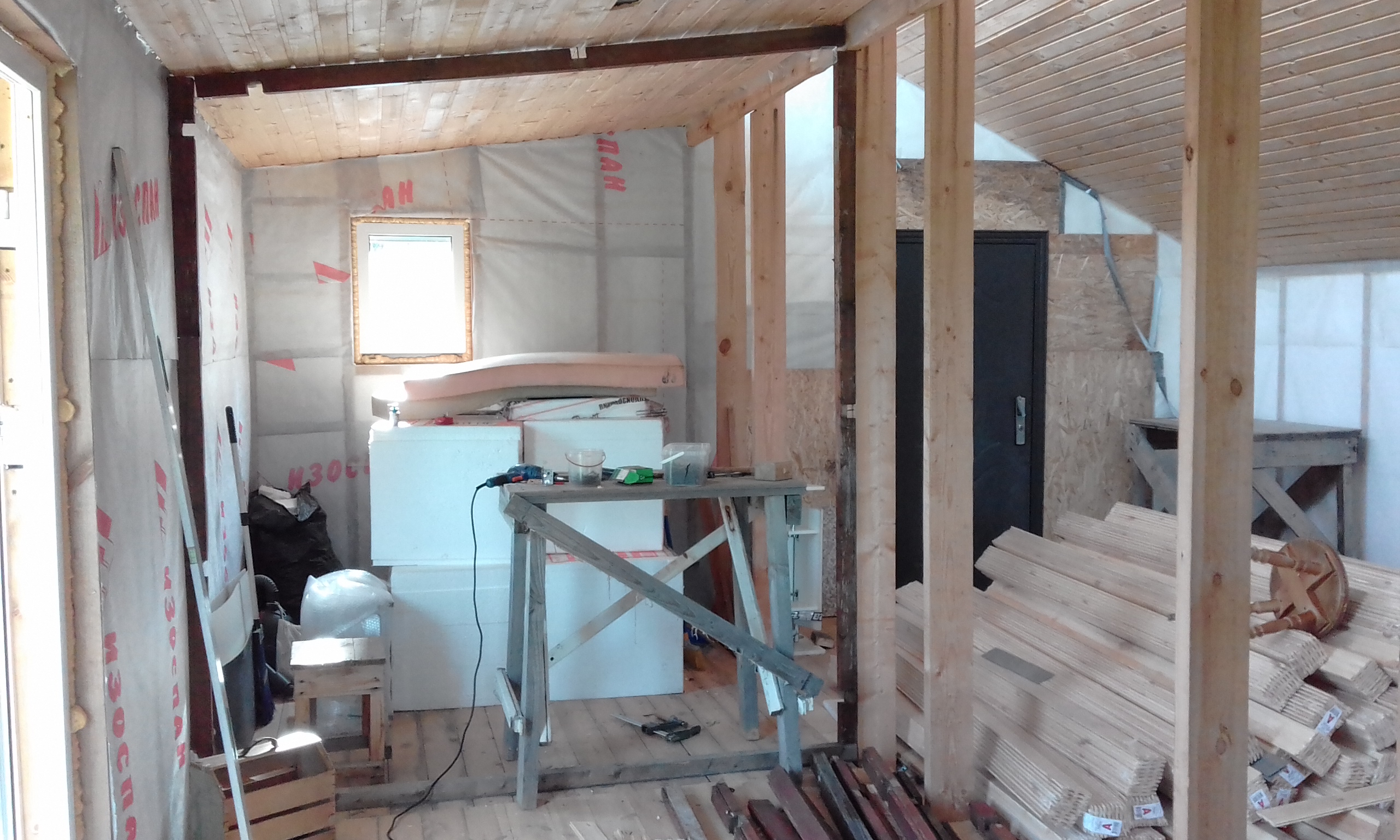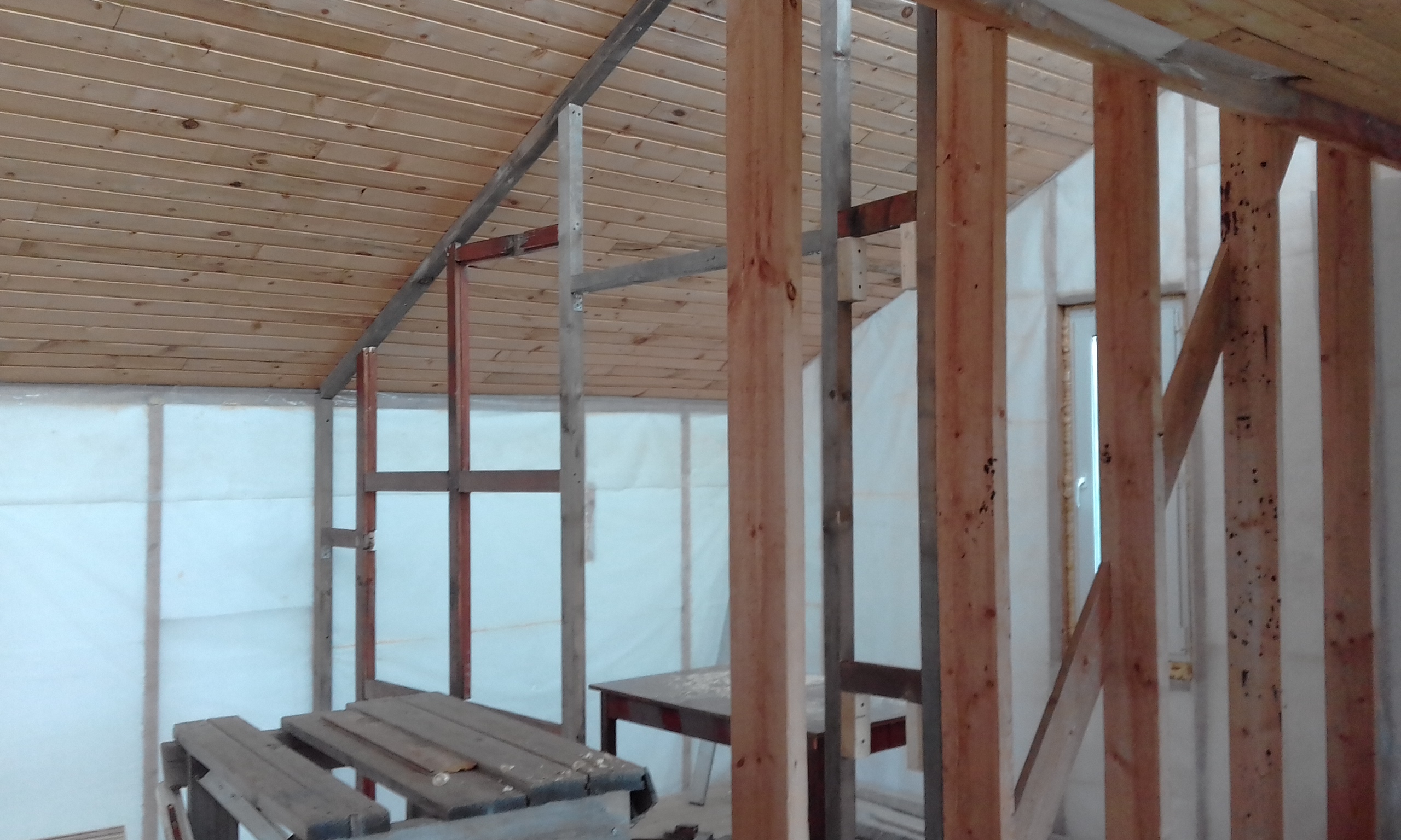 Выполнил каркас перегородки. Бруски, подобранные на помойке, хорошо смотрятся, даже жалко зашивать их.