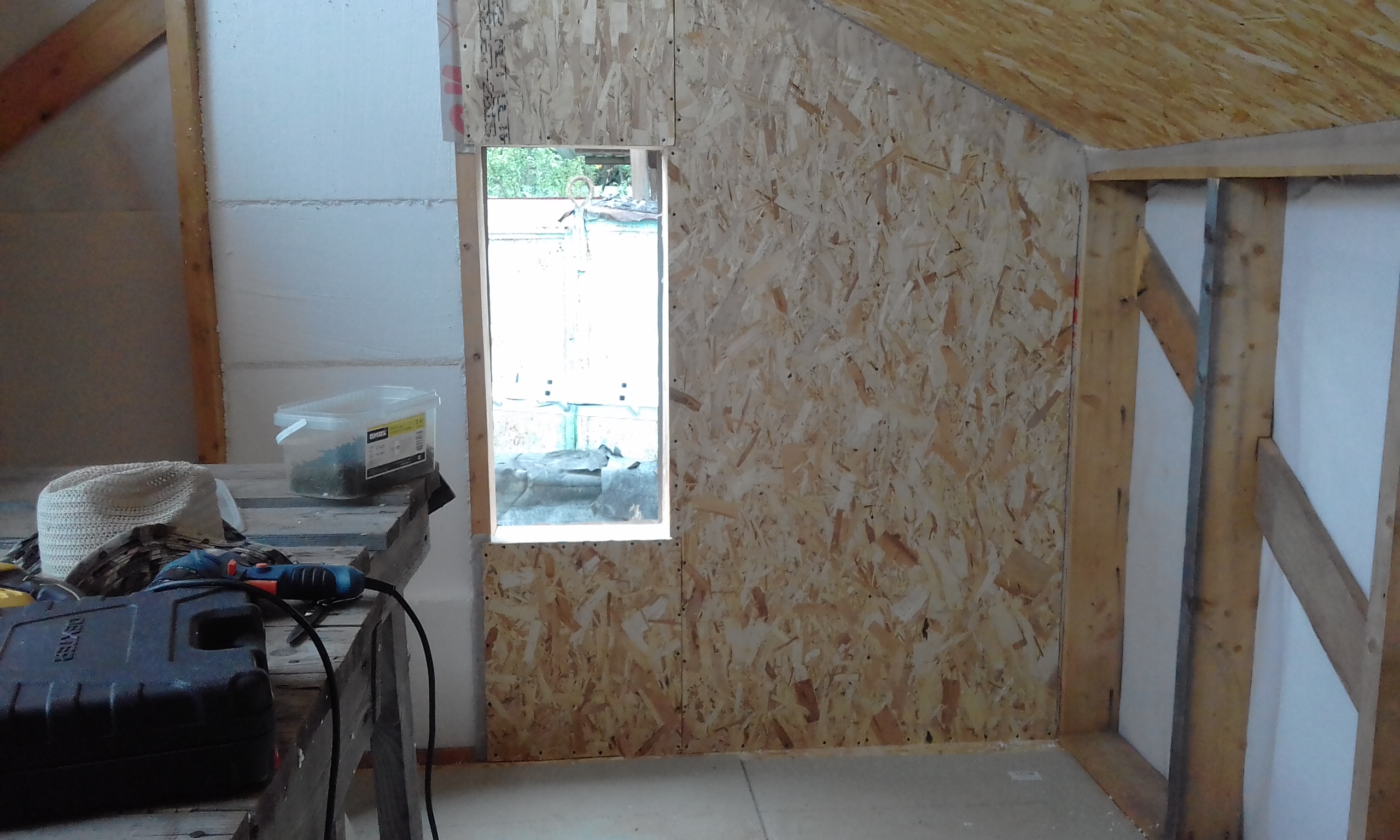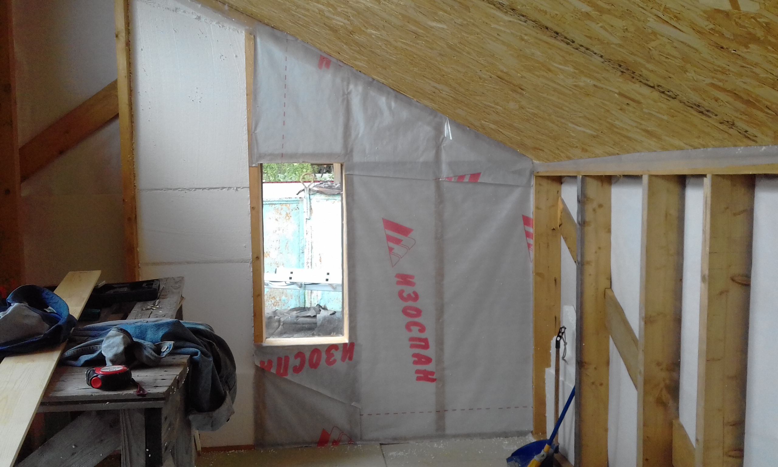 Приступил к внутренней обшивке наружных стен.