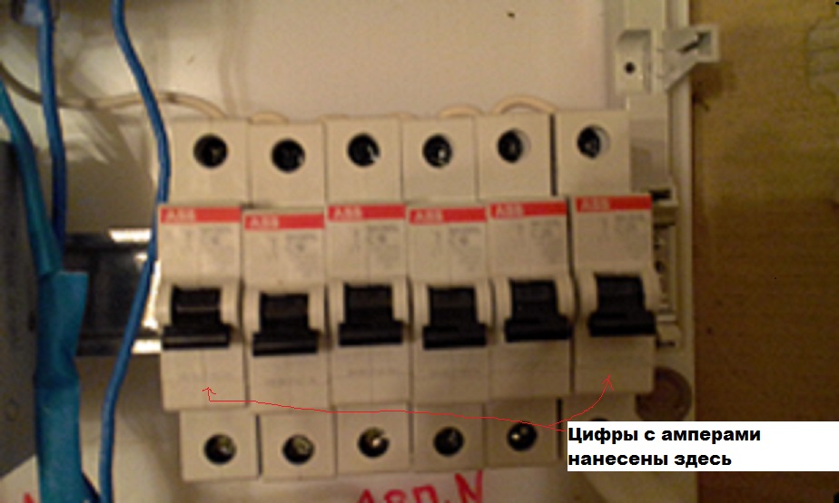 Сделал фото этих автоматов. Но цифры слишком мелкие, их не видно. Красной стрелкой показал их расположение. На фото видно, что для одного и того же тока размеры автоматов разные.