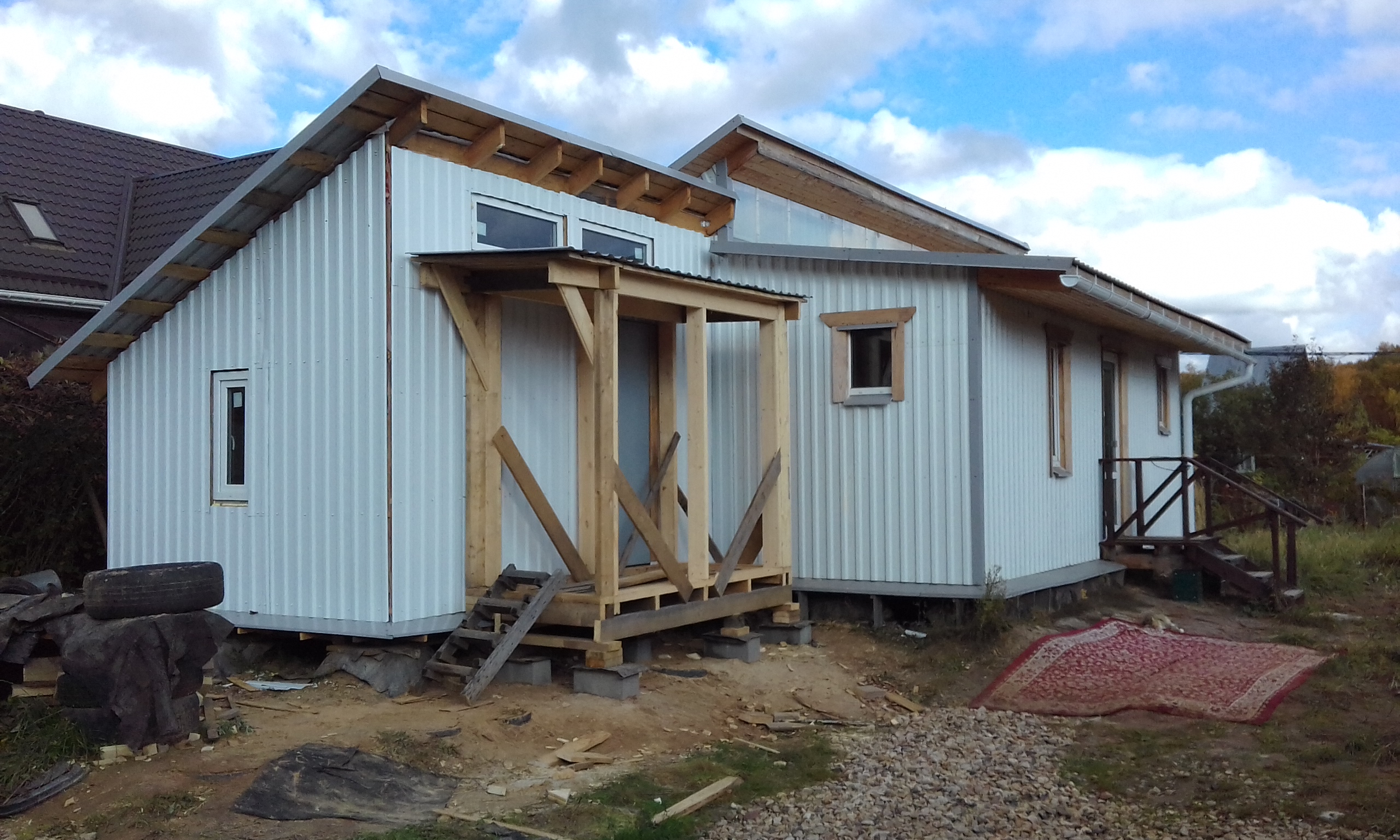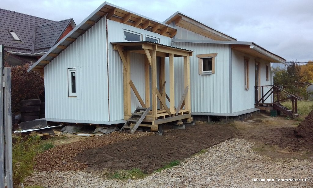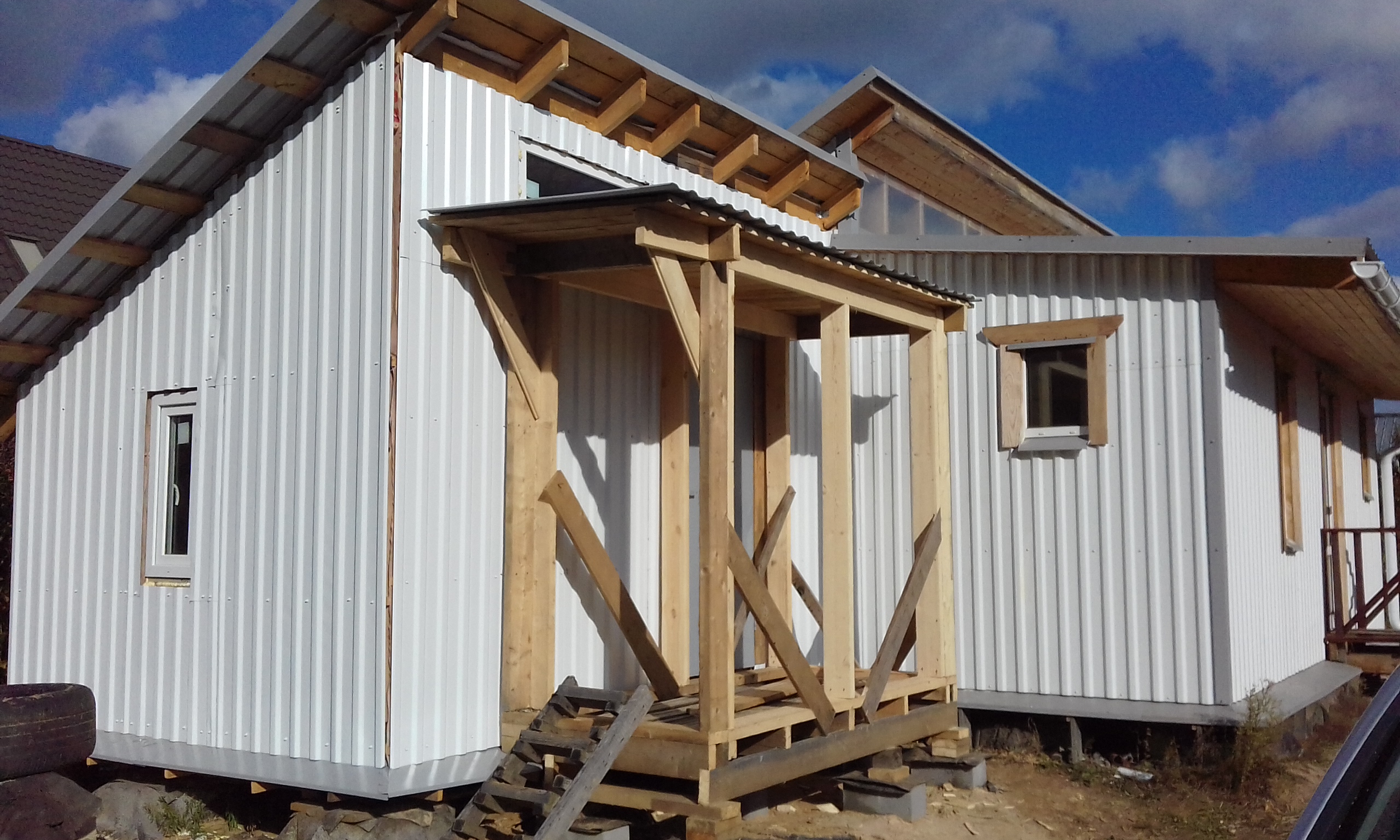 Давно я ждал погожий денёк. И вот он случился. Поспешил настелить кровлю тамбура из профлиста толщиной 0,5 мм по сплошной обрешётке из дюймовки + контробрешётка для проветривания.