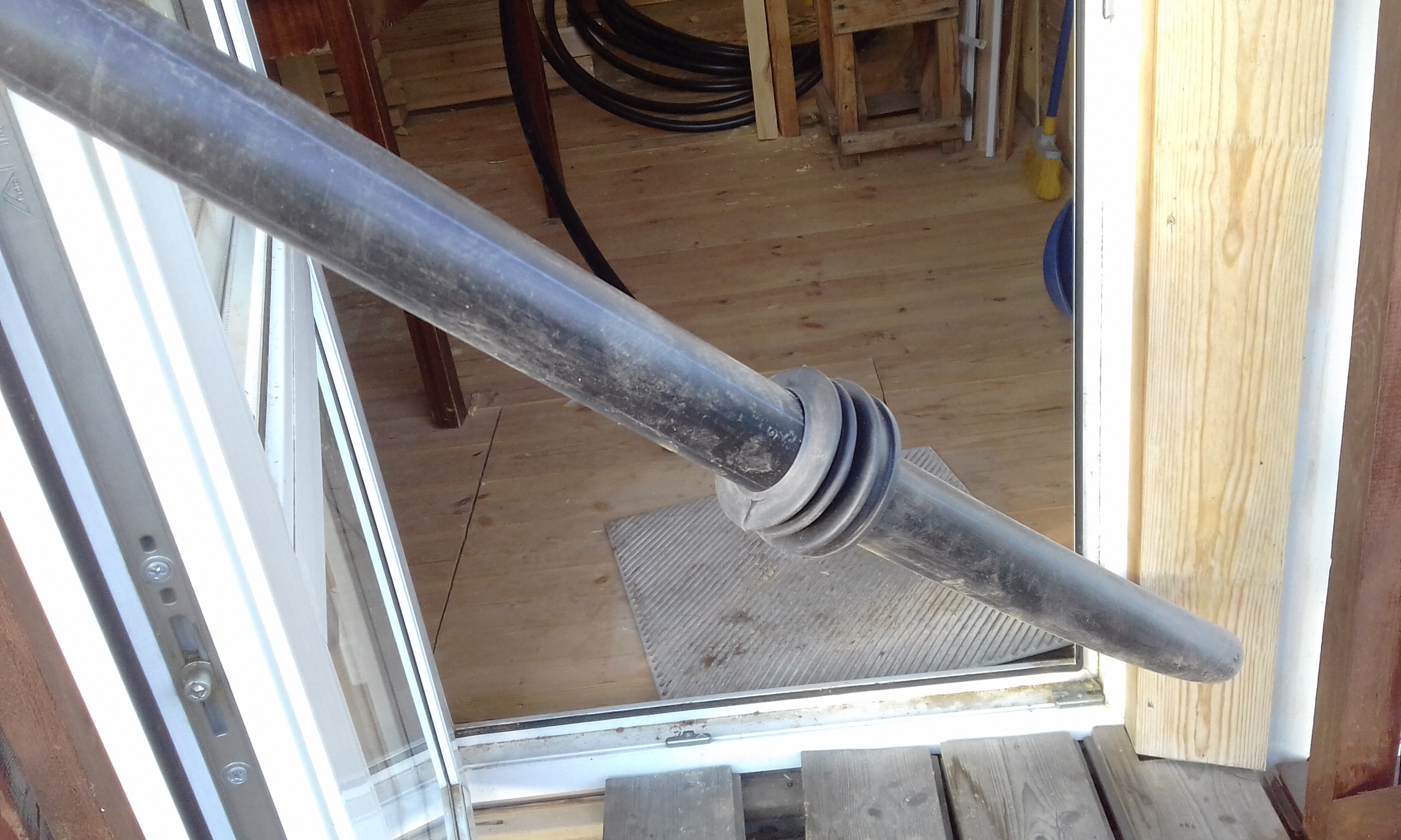 Просверлил коронкой отверстие в кольце колодца, на аквариумном герметике вставил резиновую манжету.
