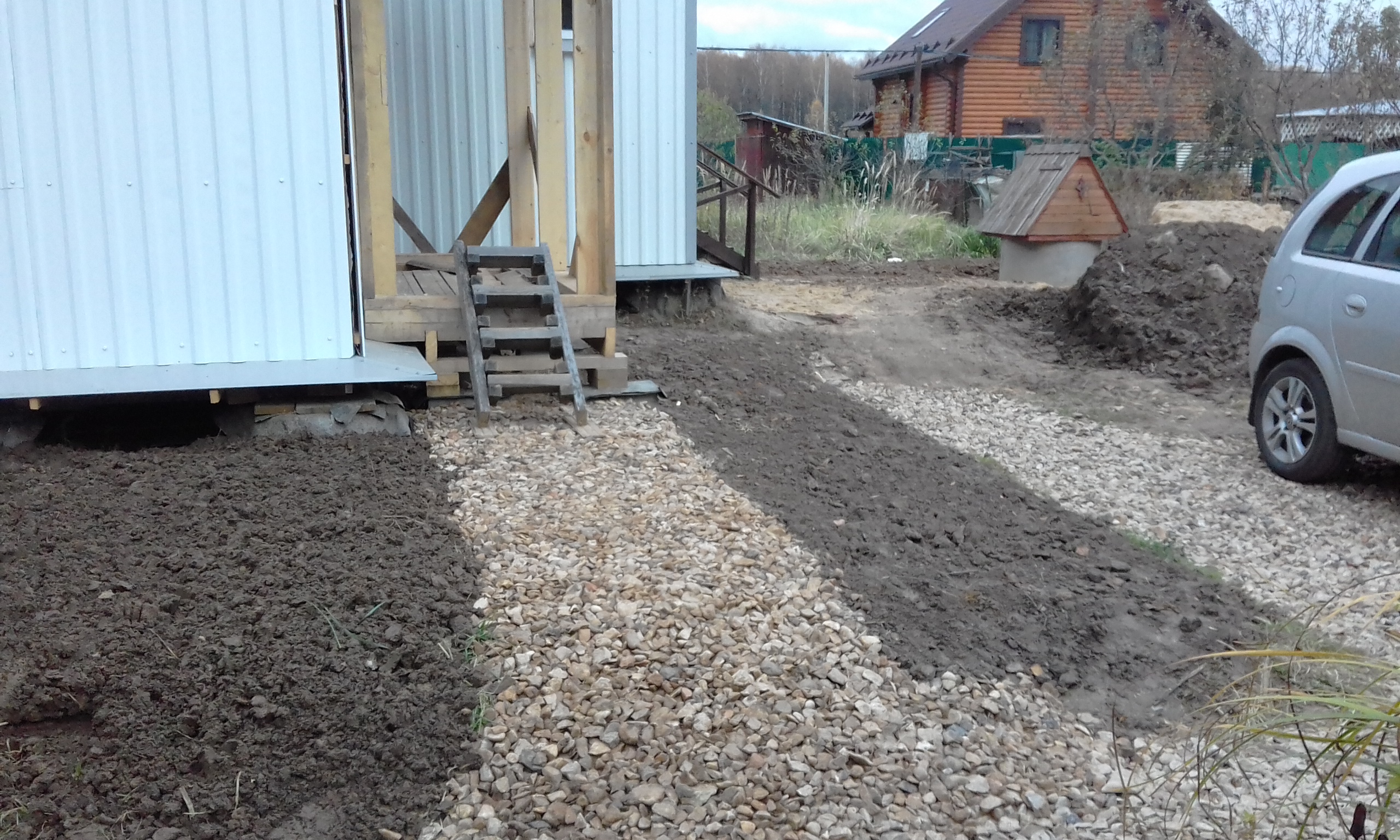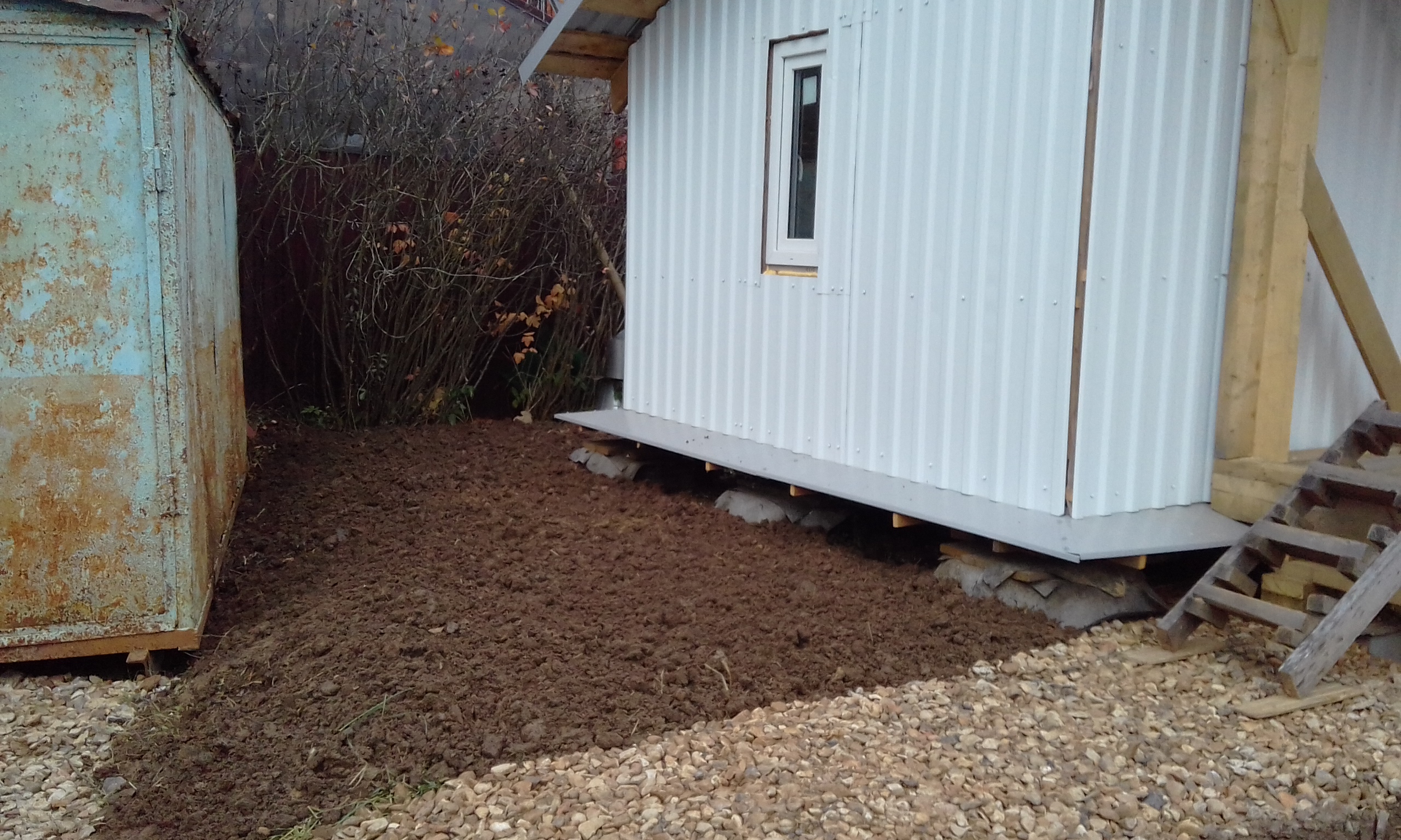 Выполнил благоустройство части территории. Отсыпал растительный грунт. Благо стоит сухая погода.