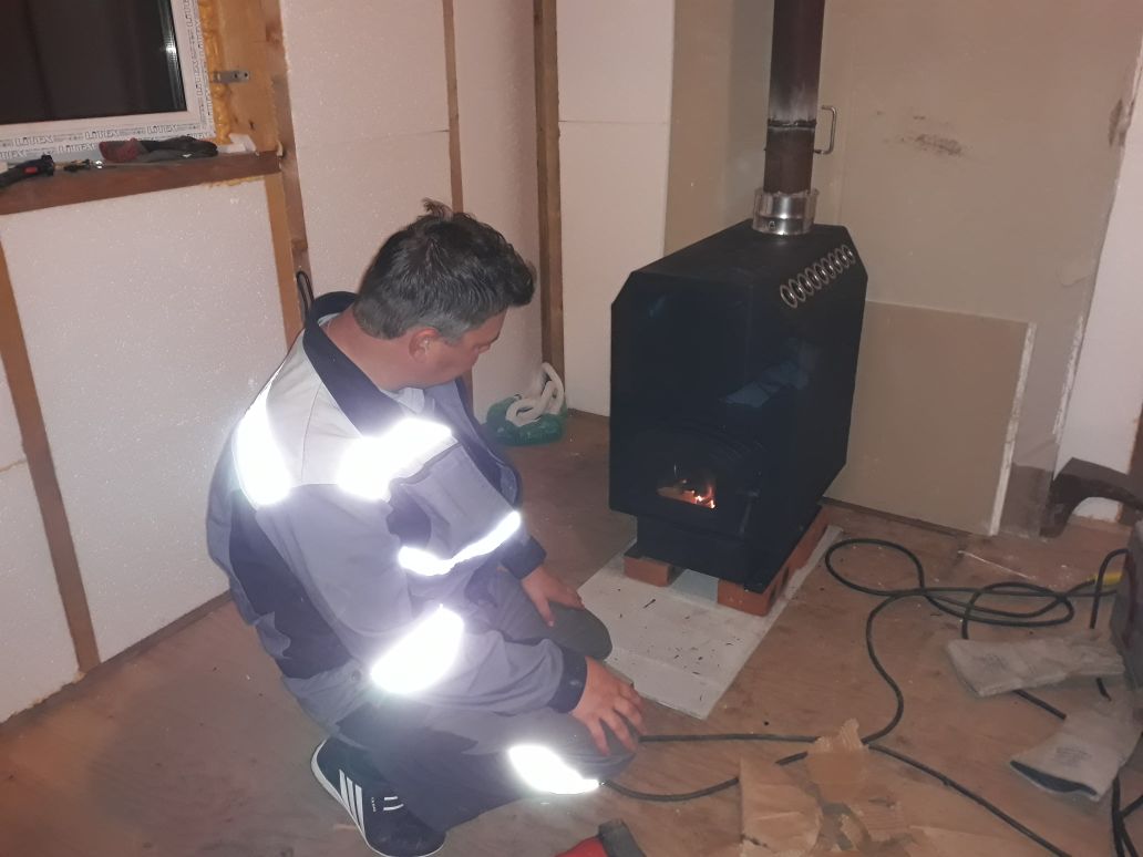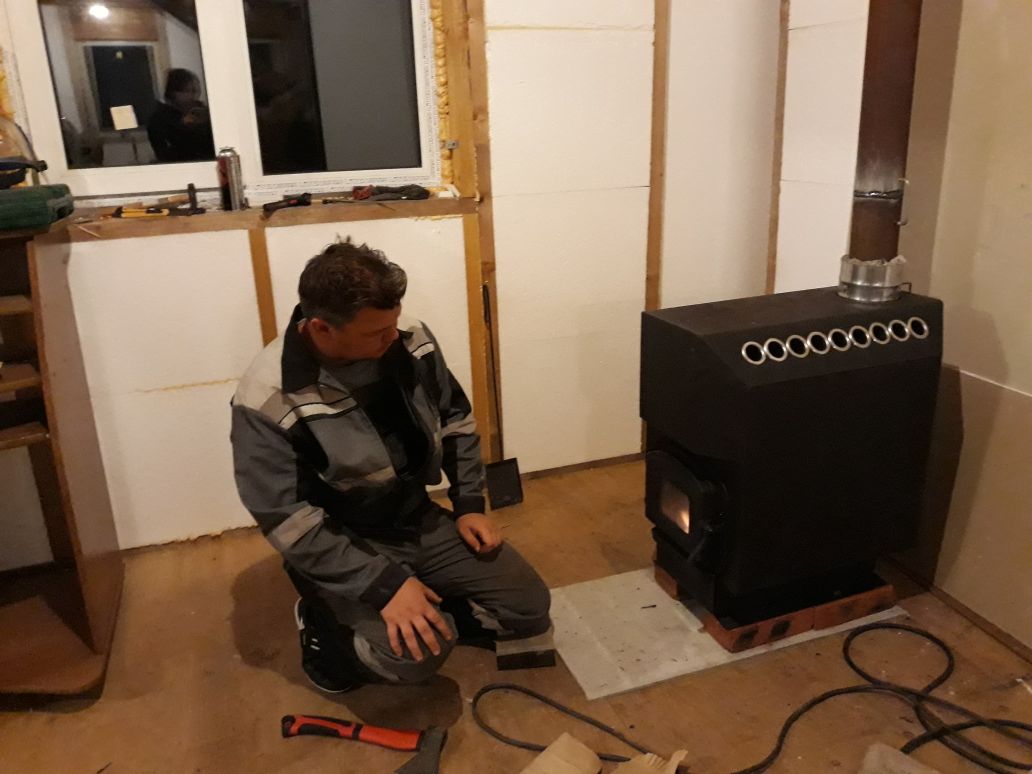 Поставили печку на кирпичи и лист шифера, ну и затопил