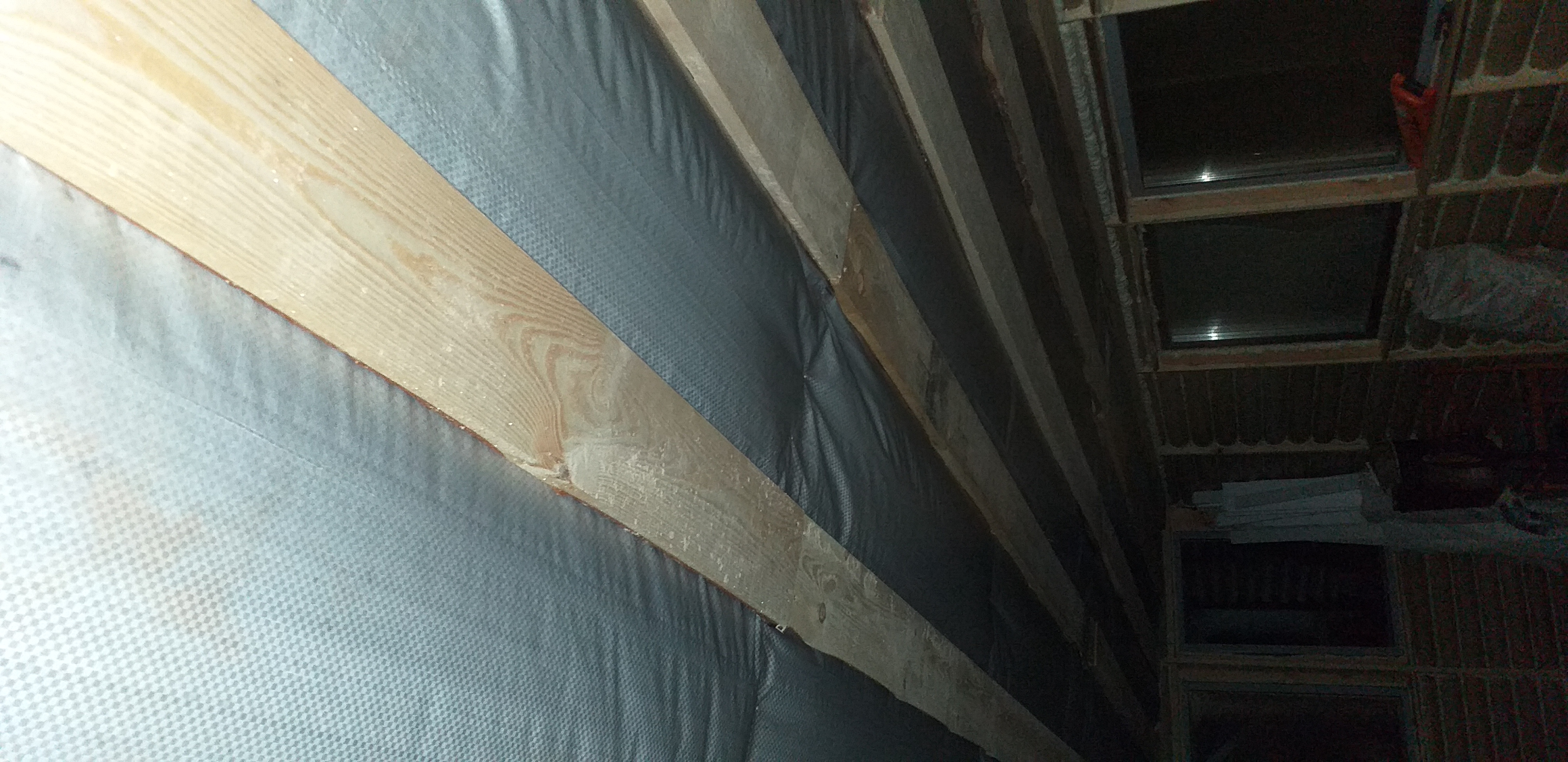 За всякими делами я забыла написать, что засыпали потолок. Крошка такая текучая, что ее не задували а просто засыпали в тихую безветренную погоду. Сняли железо, снизу натянули паро-гидро-ветро, засыпали крошку, она не трамбуется не фига, растекается просто.Насыпали побольше, затянули сверху гидро-ветро, проложили рейку и прикрутили железо. Так когда сверху ее прижали чуток - она снизу выпятилась. На фотках не стена , а потолок. И ночь.
