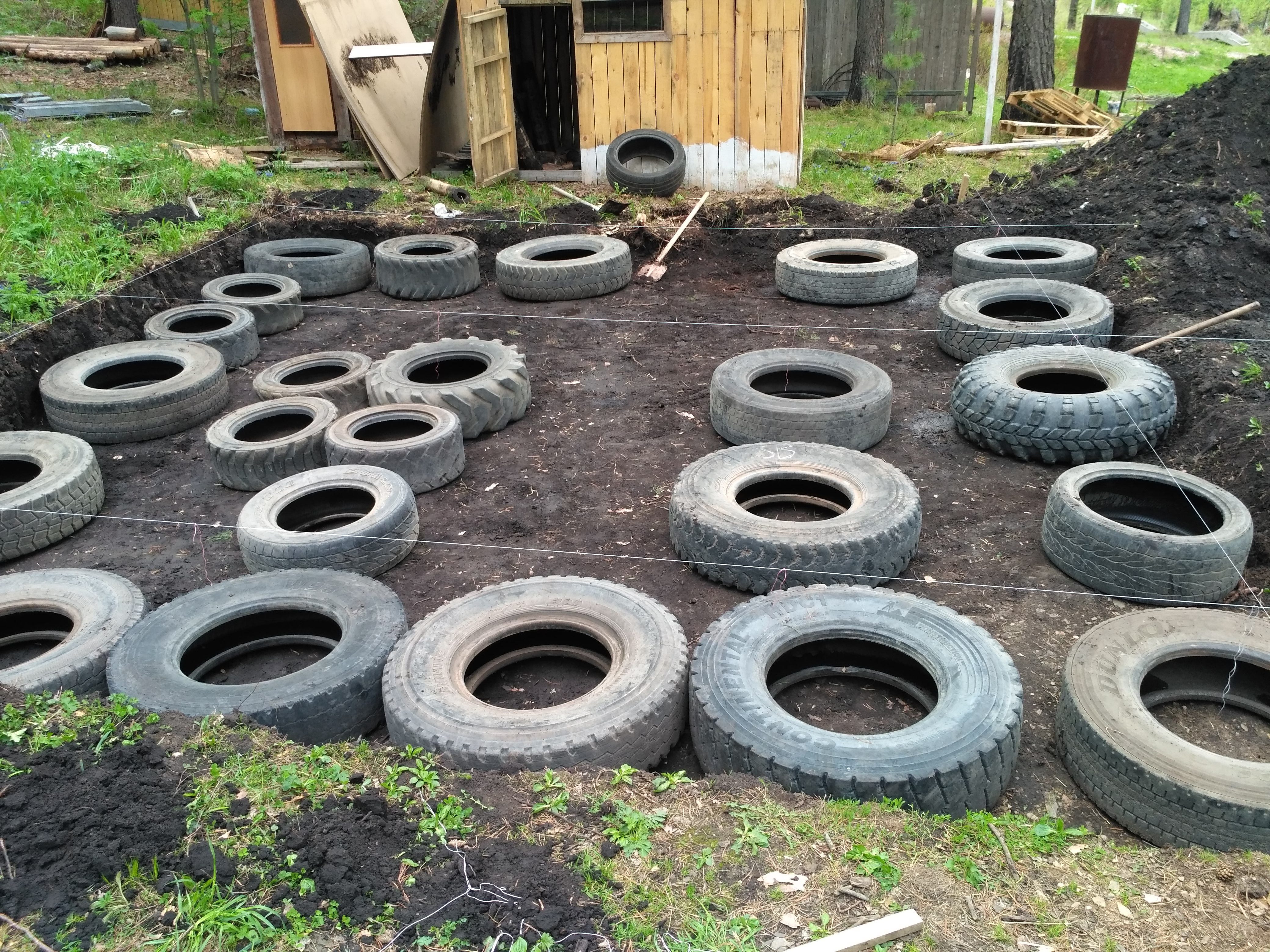 поставлю покрышки в два ряда, причем внизу грузовые, сверху легковые: экономия бетона на верхней покрышке + подобие тисэ.