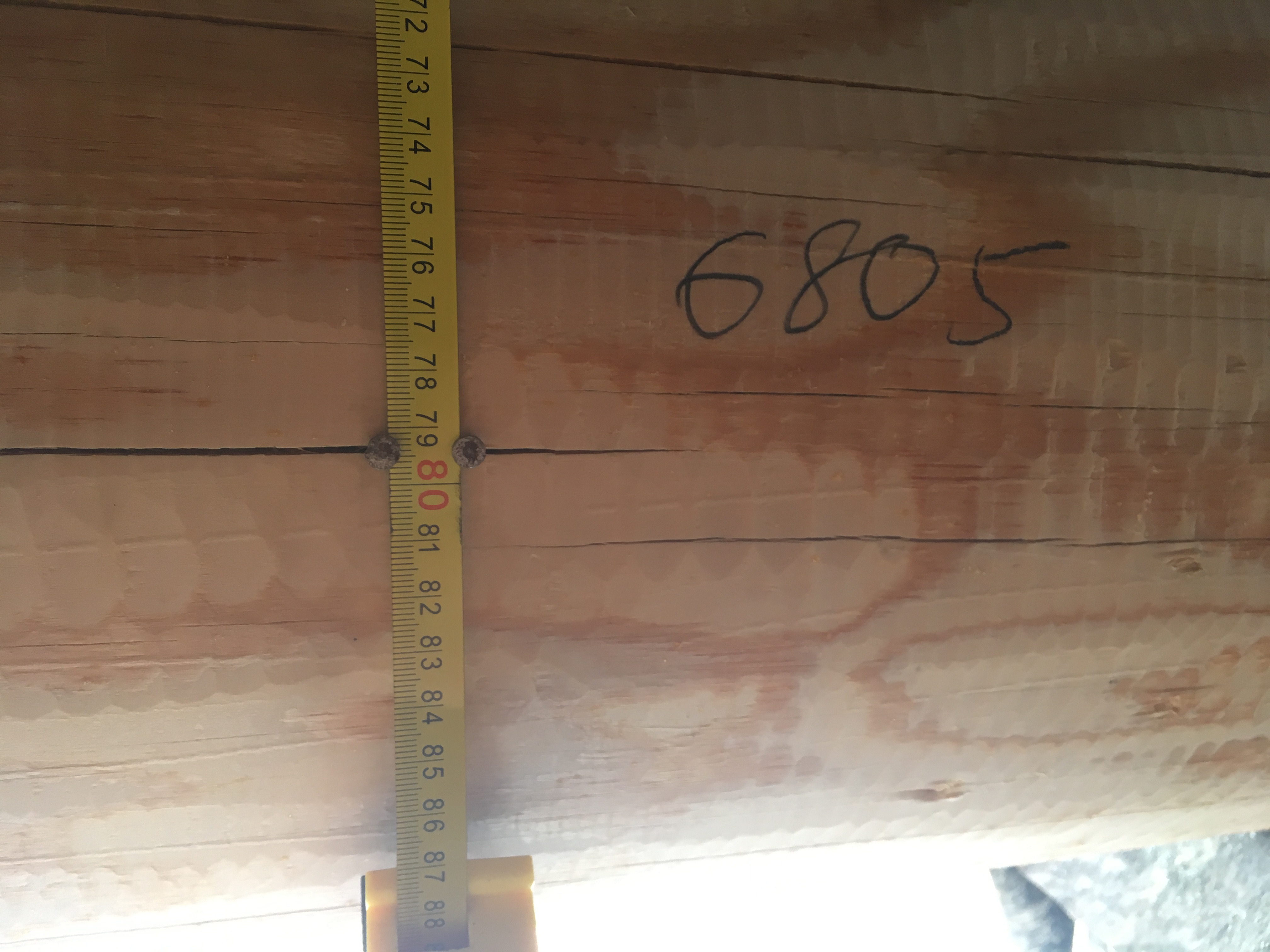 Вот фото - рулетка была закреплена под коньком сразу после установки крыши (в конце августа), карандашом написана начальная отметка на самом нижнем бревне 6805мм, сейчас как видим 6795мм, т.е. за это время весь сруб дал усадку всего 1см.
