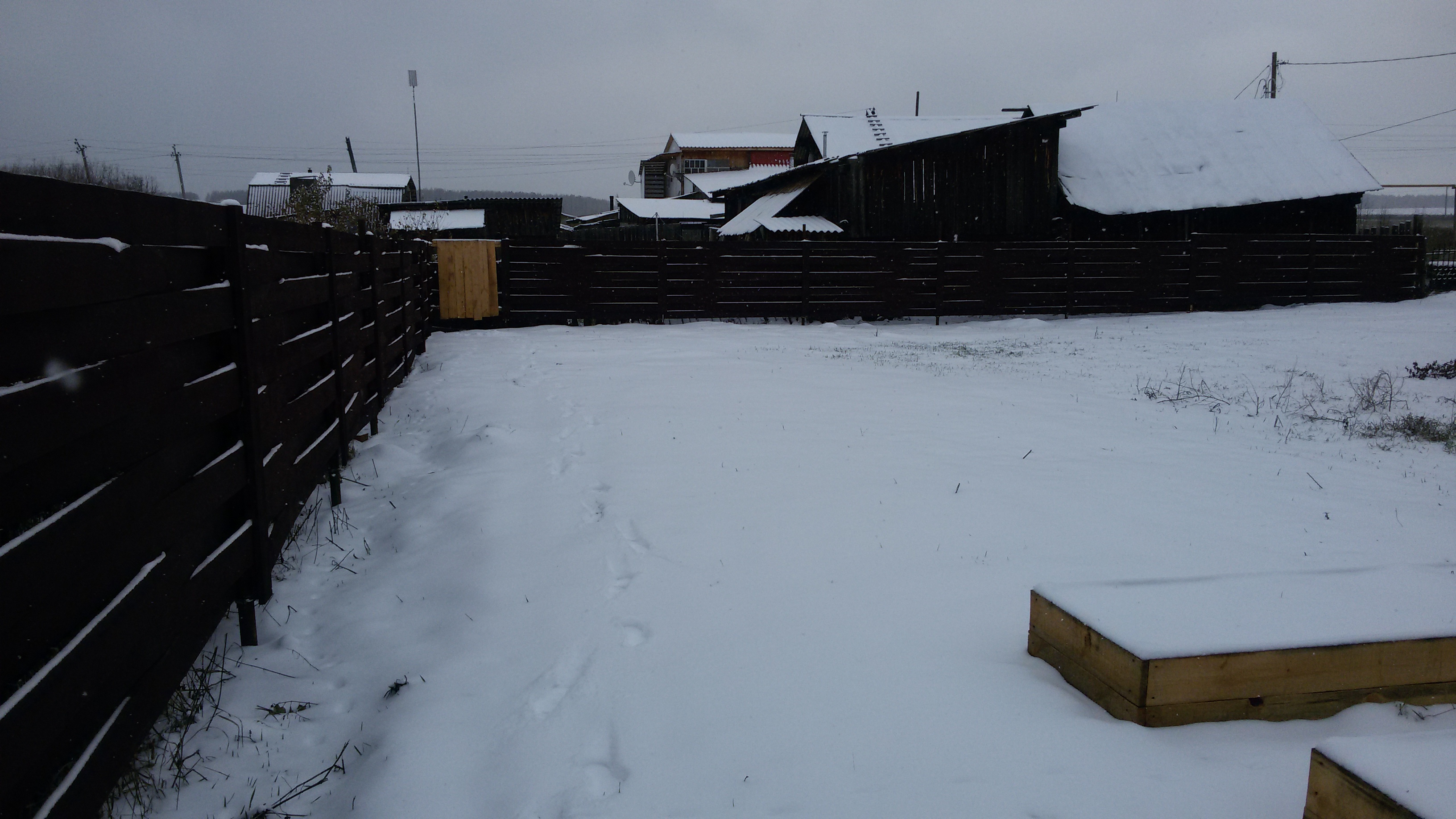 Это в конце октября (фоткала вечером, плохо видно). Не покрашенные доски - там будет калитка между нами и соседями, летом будем делать, не успели в том году.