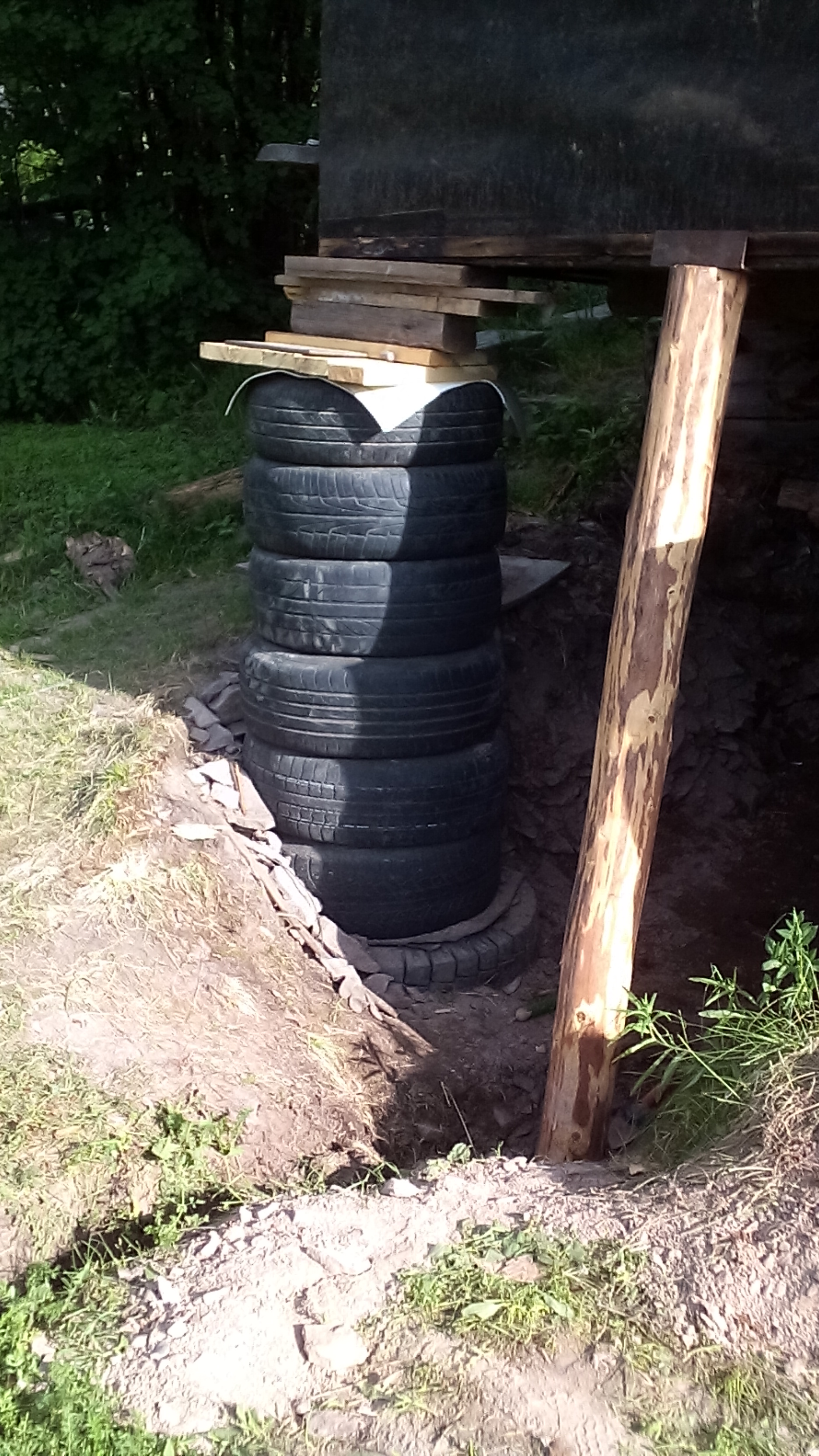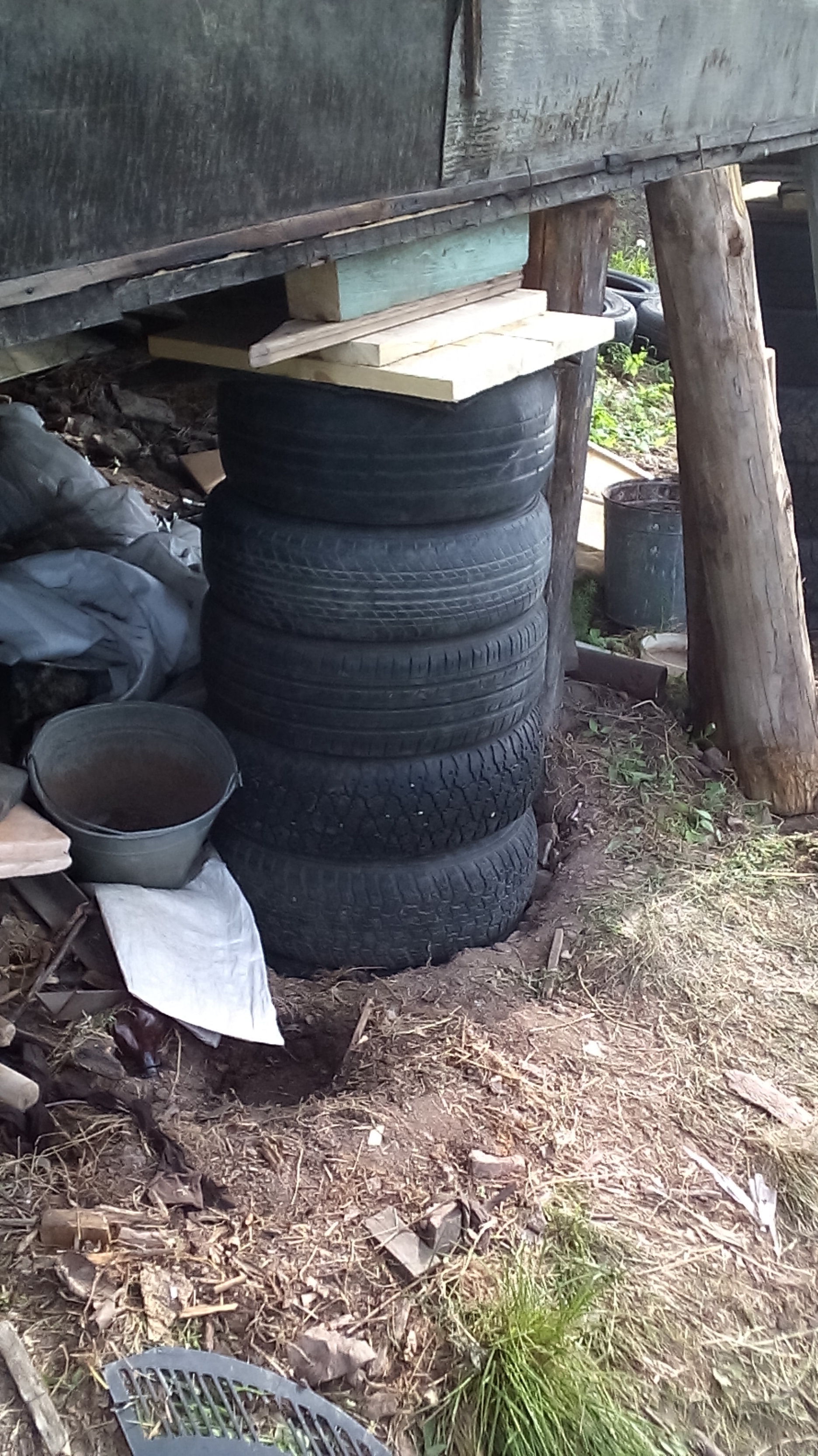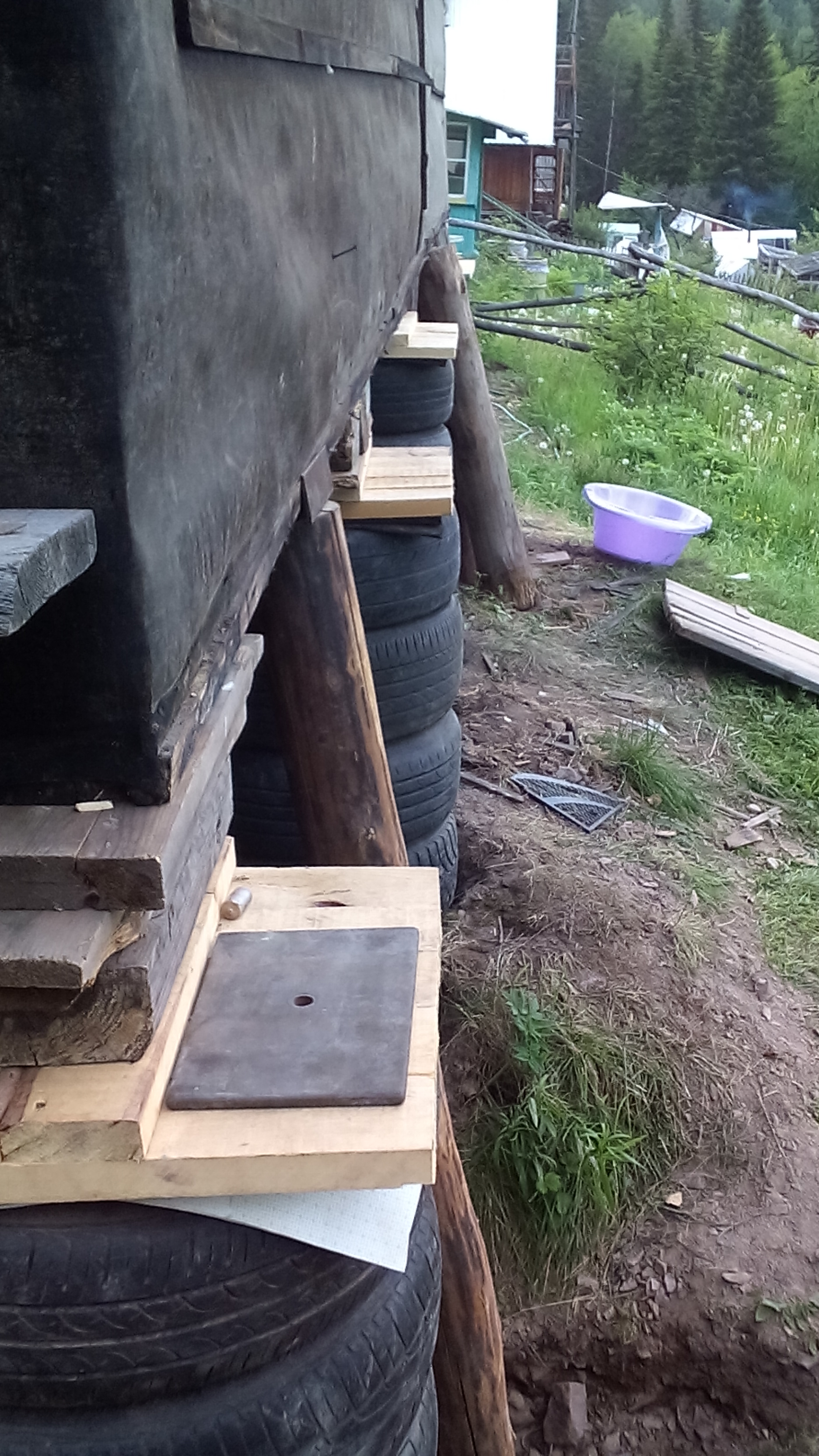 7. Снаружи по периметру делаю дренаж на глубину см 30 (на сколько от покрышек отступить?), отсыпку, утепляю, цоколь тоже утепляю завалинкой.