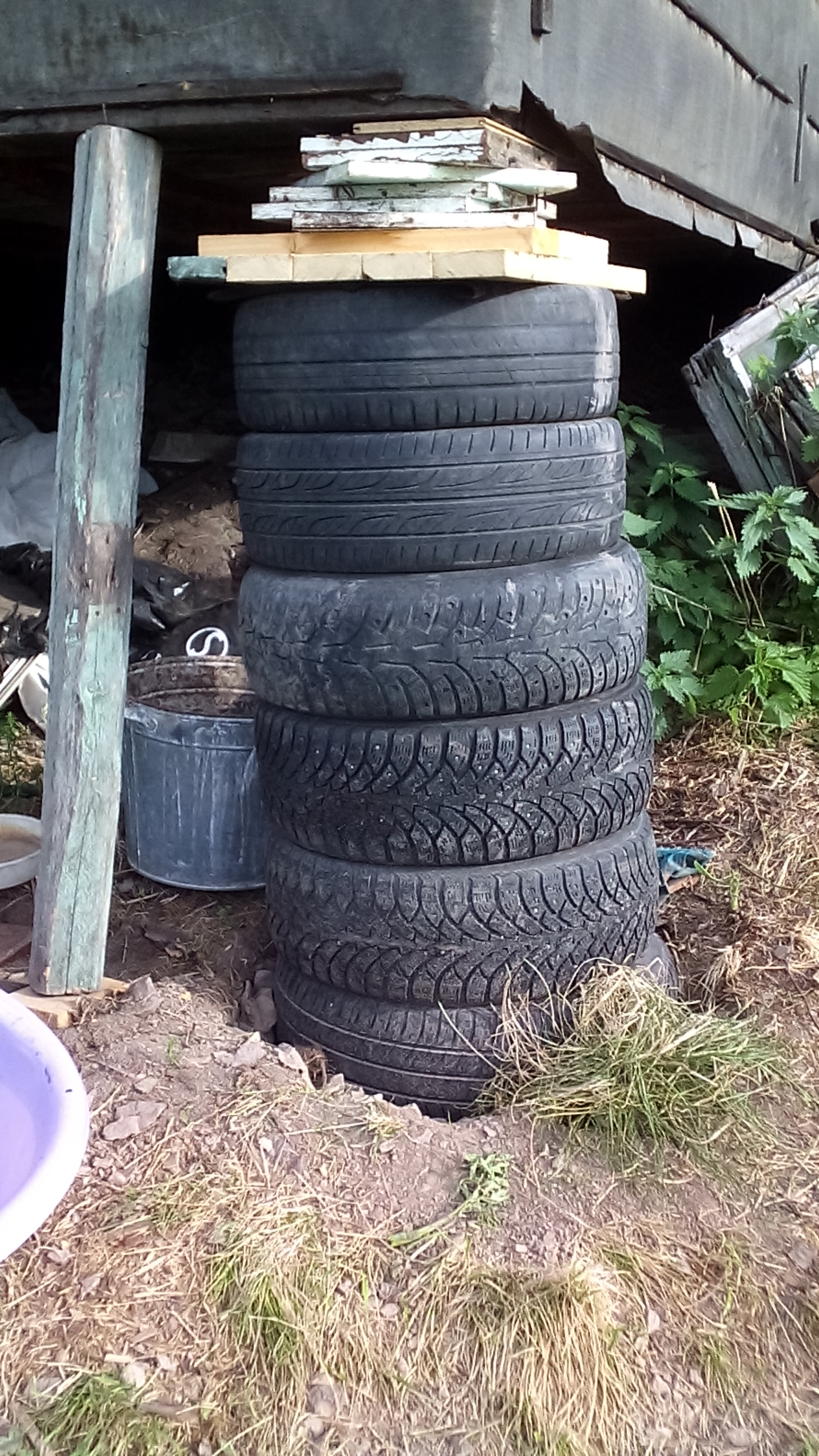 4. Выкладываю второй ряд покрышек, забиваю (или заливаю тощим бетоном как у Олега...???).