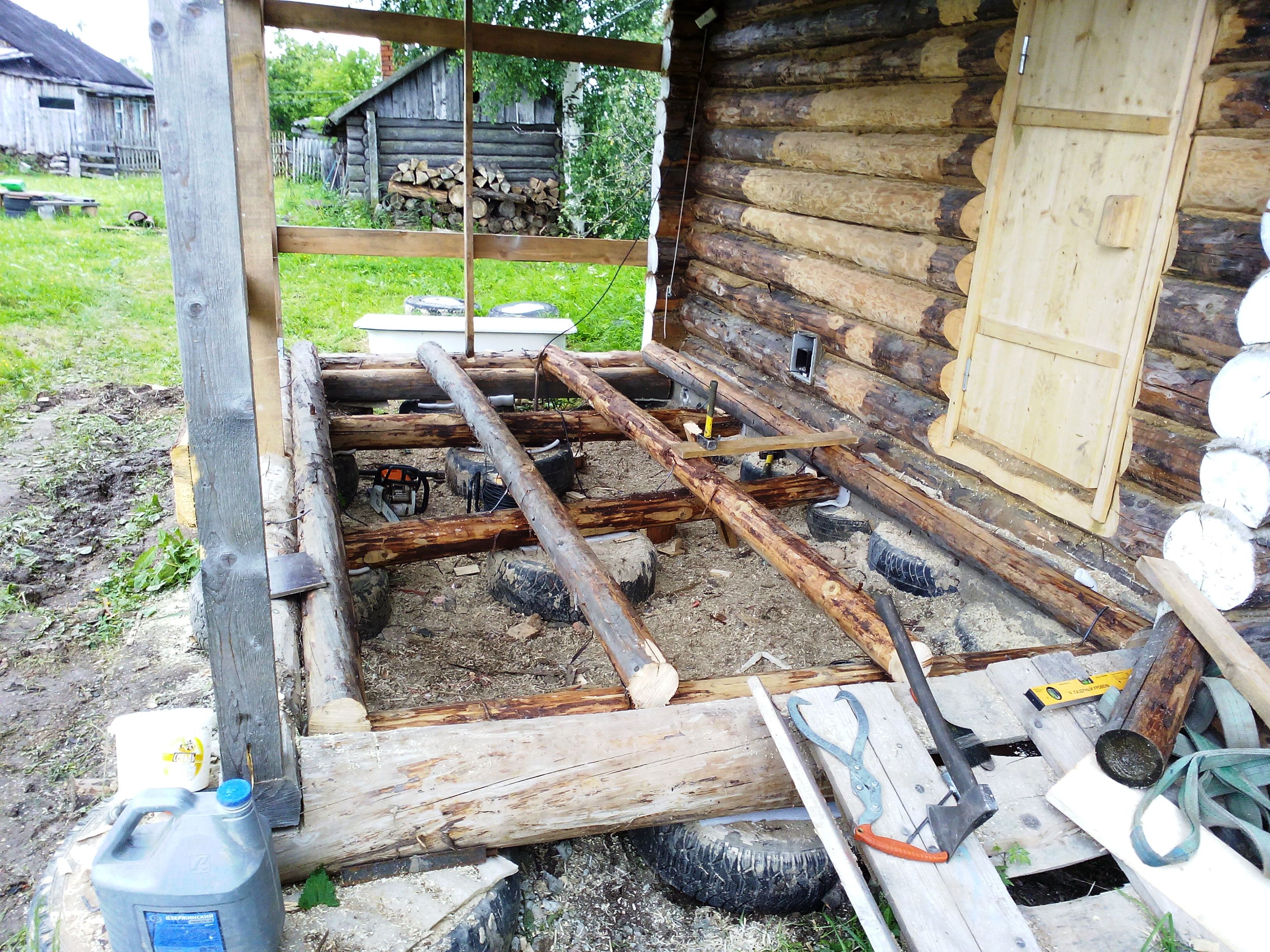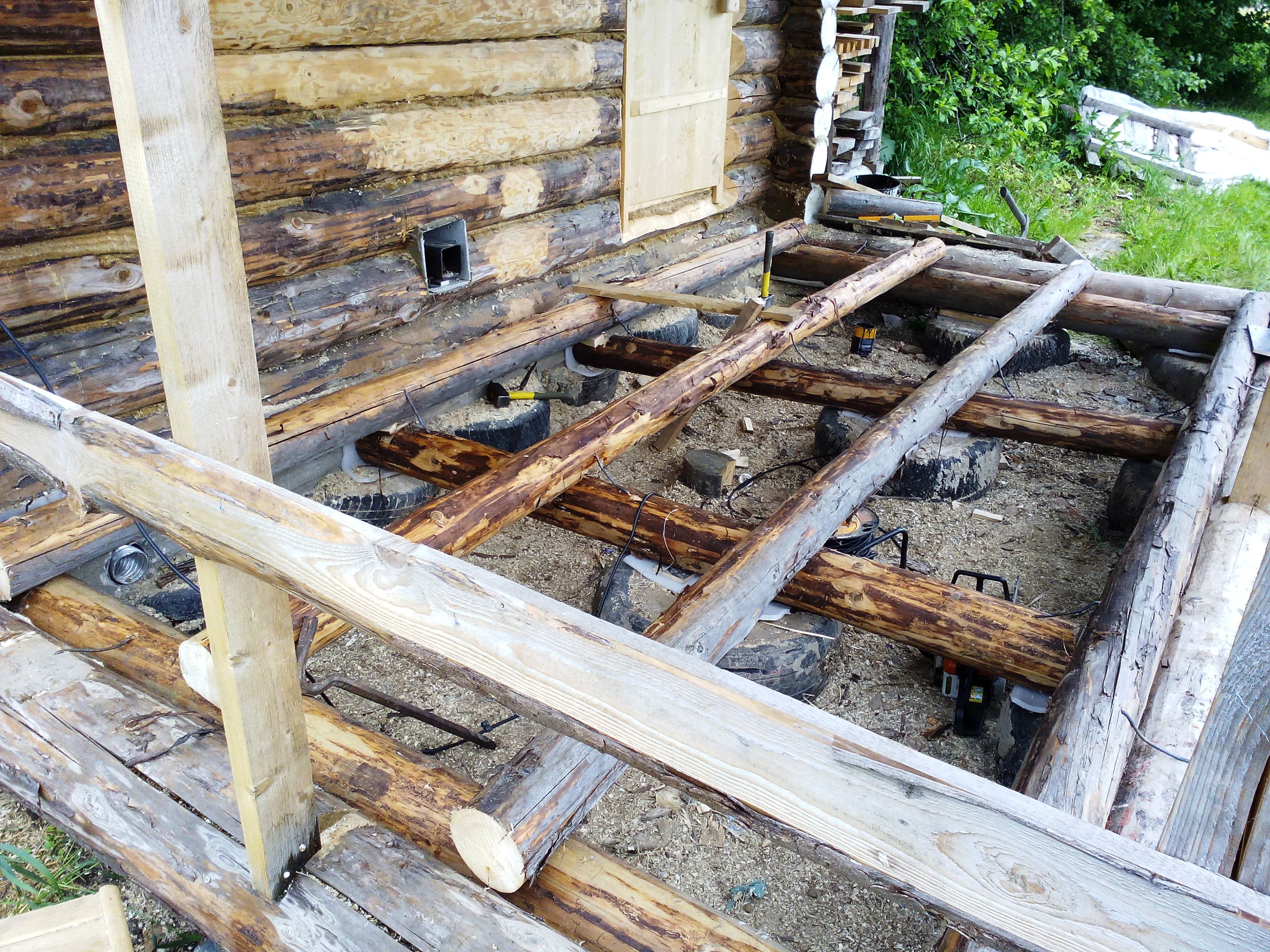 Я поставила под половые лаги деревянные столбики на гидроизоляцию. Что им под домом-то сделается? Покрышки только по обвязке.