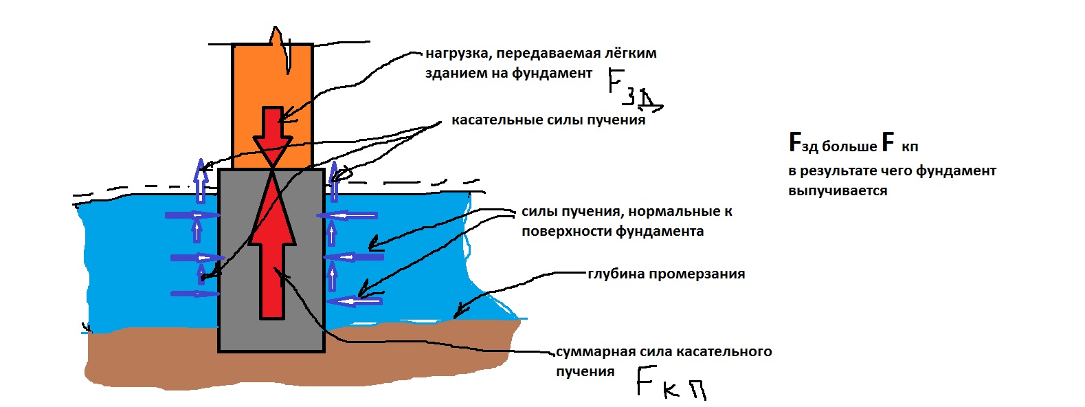 "В соответствии с нормами по проектированию оснований зданий и сооружений глубина заложения фундаментов в пучинистых грунтах должна приниматься не менее расчетной глубины промерзания. В этом случае подошва фундамента освобождается от воздействия нормальных сил пучения. Однако глубоко заложенные фундаменты имеют развитую боковую поверхность, по которой действуют касательные силы пучения. Эти силы превосходят нагрузки, передаваемые легкими зданиями на фундаменты, в результате чего фундаменты выпучиваются.