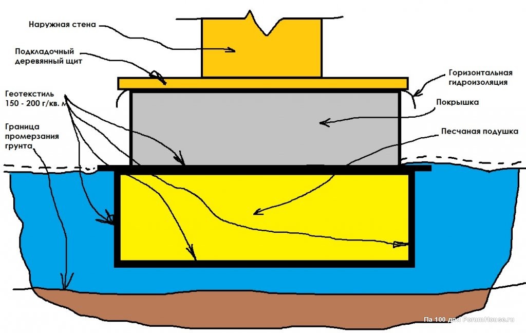 Отрывается ямка глубиной минимум 40 см. В неё послойно засыпается песок с проливкой и трамбованием, затем на эту песчаную подушку устанавливается конструкция фундамента.