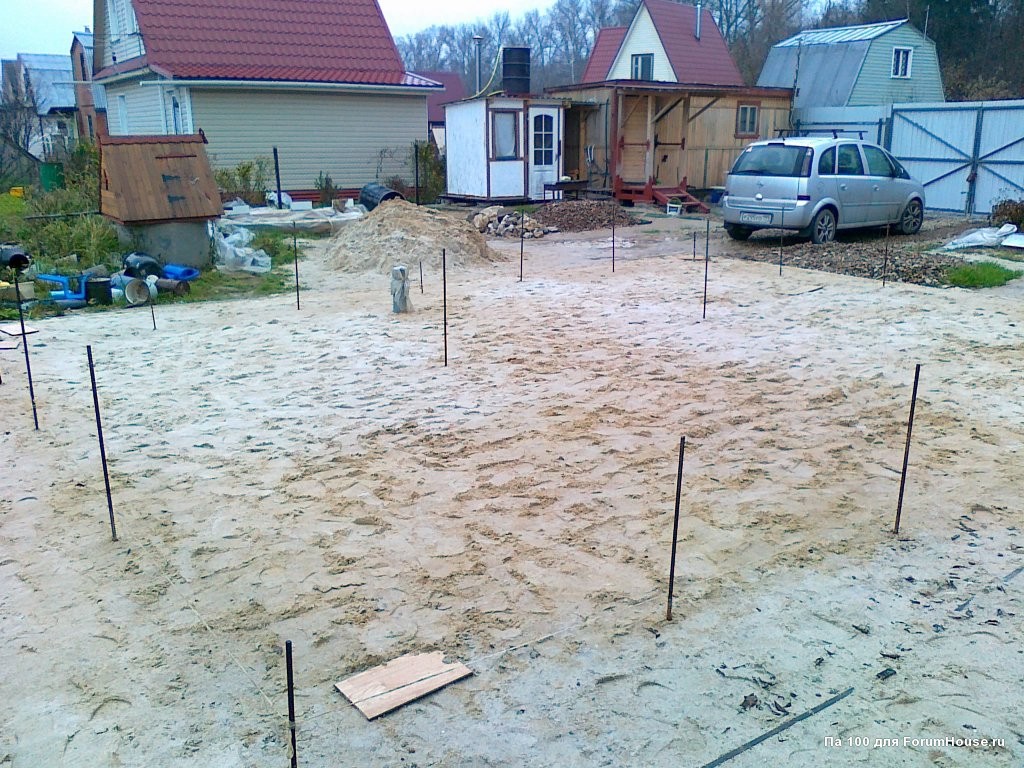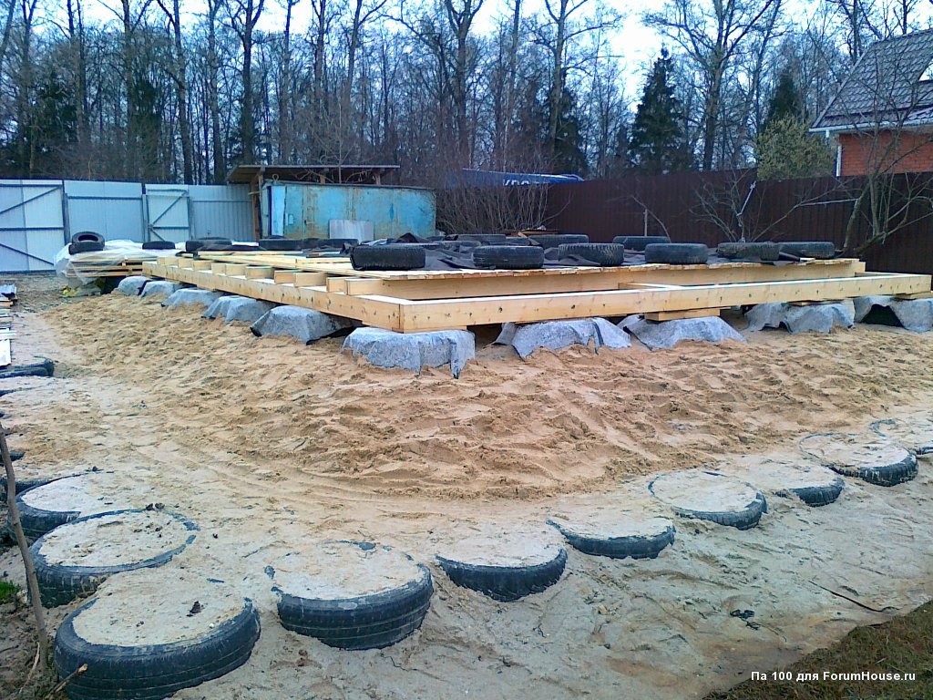 Хотел бы рассказать только о варианте незаглублённого фундамента, состоящего из набитых инертными грунтами покрышек-тумбочках, установленных на песчаную подушку.