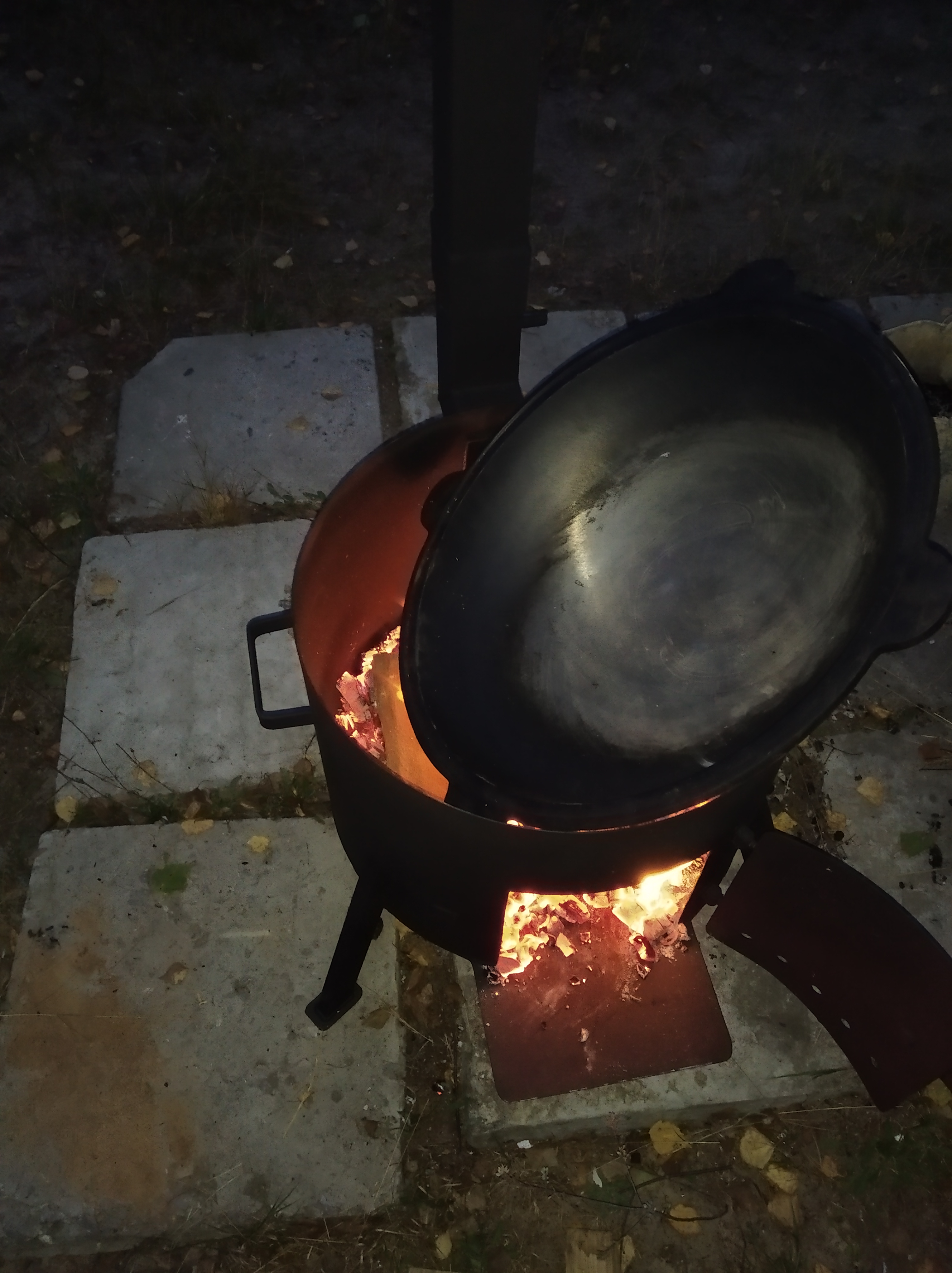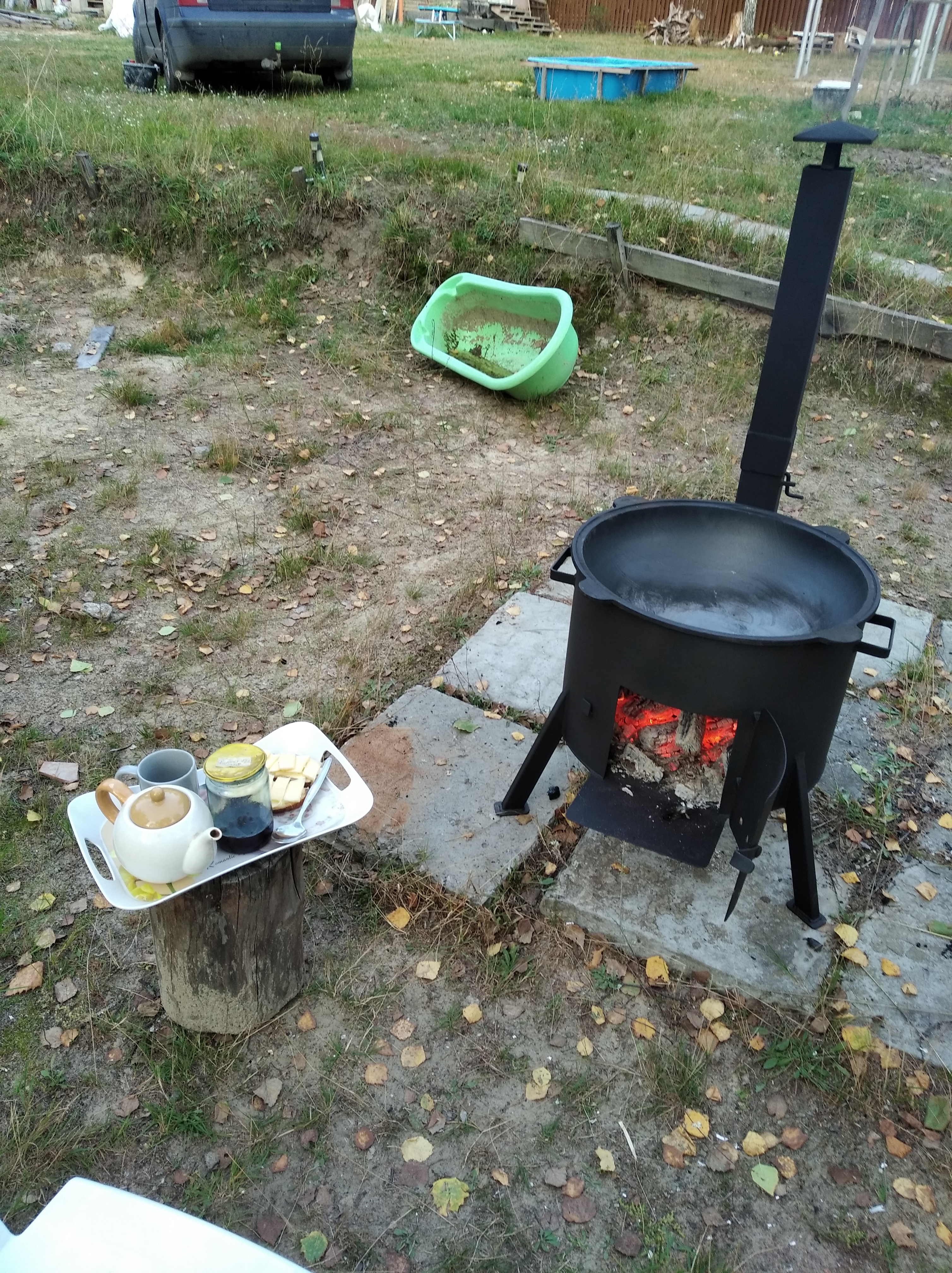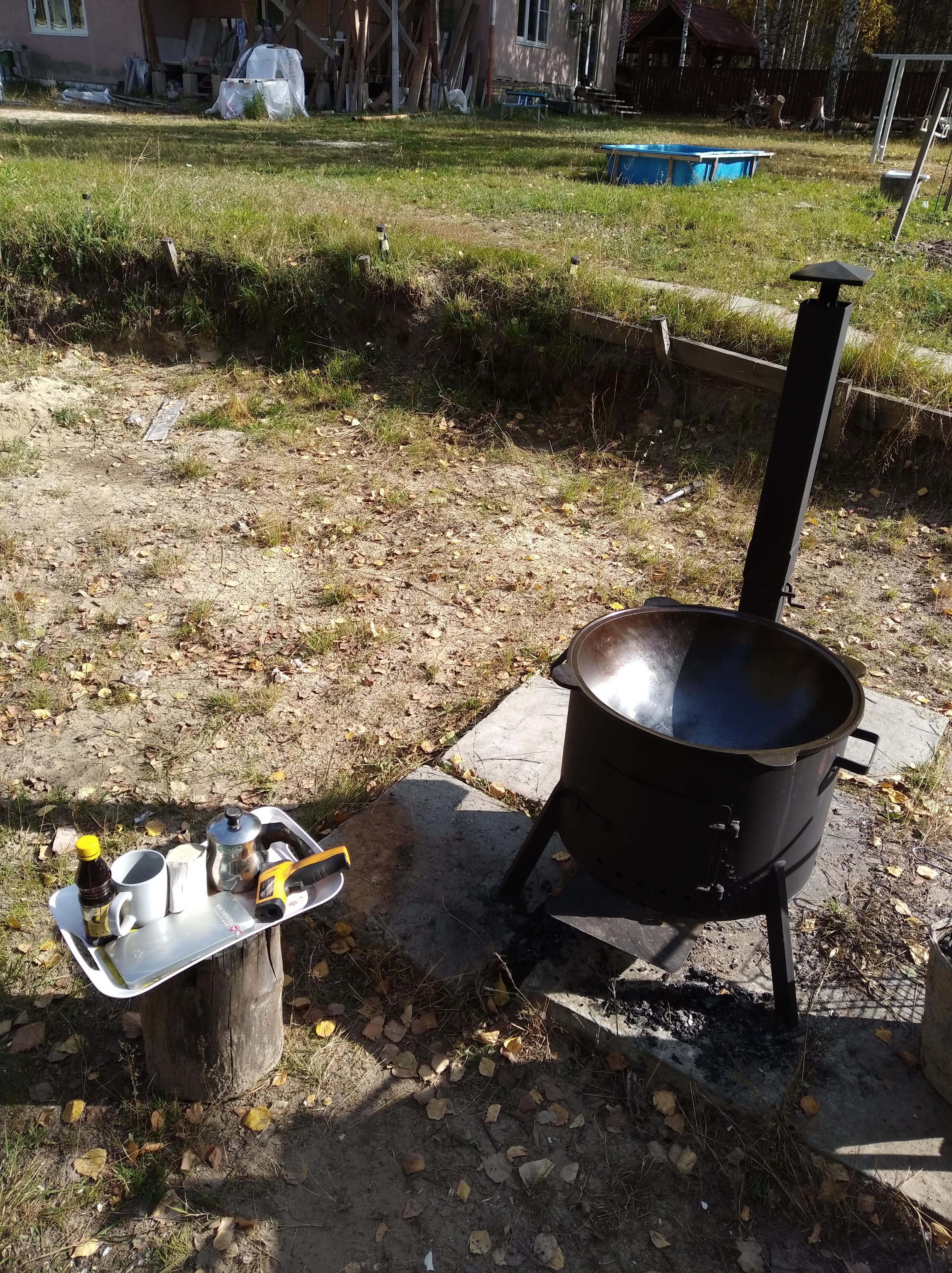 Сегодня с утра в ожидании гостей и первого боевого испытания казана решил сначала скипятить в нём воду, типа заодно и помыться