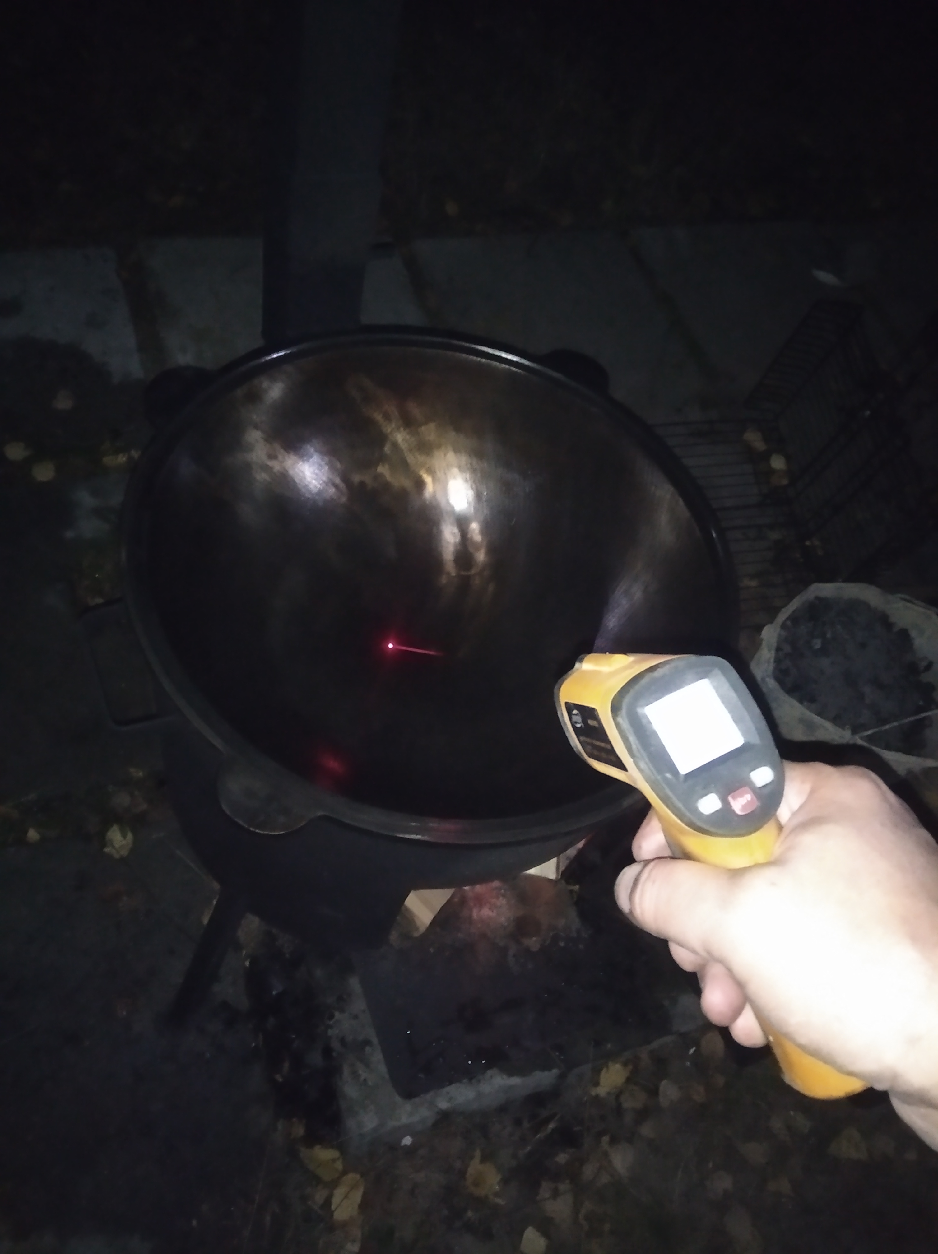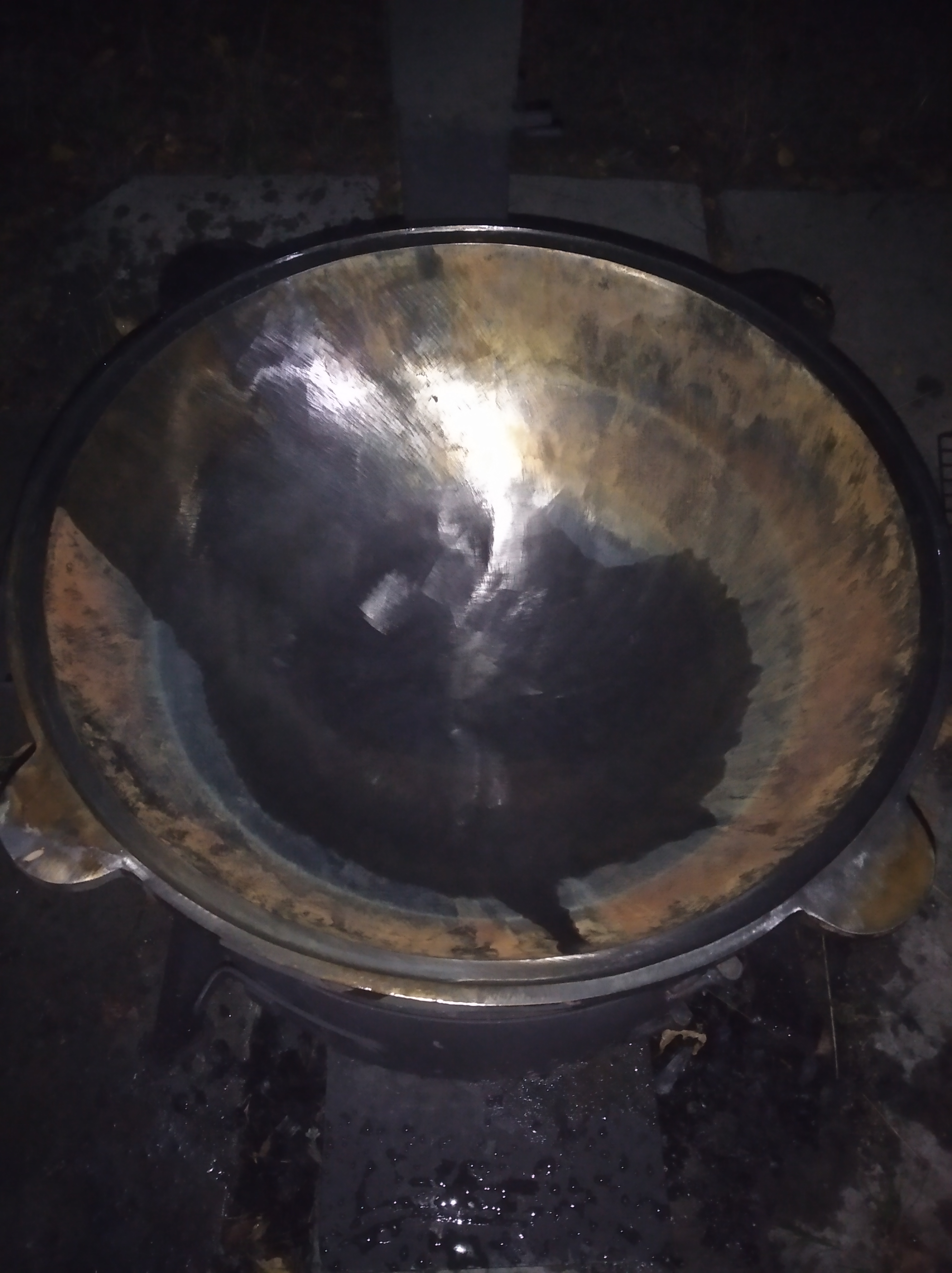 и вот нагрелась вода где-то до 70гр, смотрю а в казане плавает какой-то чёрный ошмёток и на дне что-то поблёскивает