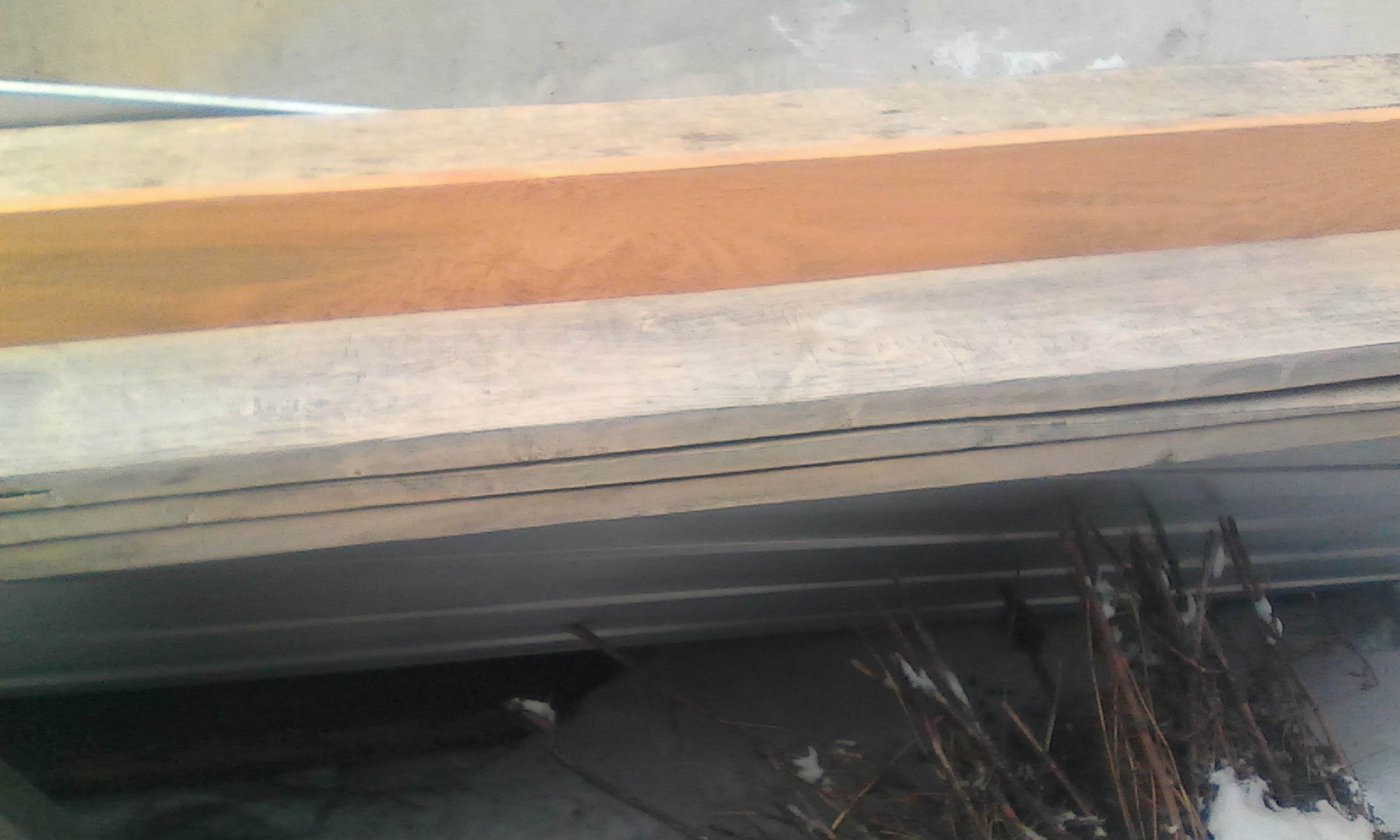 За время моих гуляний в новогодние праздники, у меня высох раствор купороса с известью, я его развел теплой водой и помазал доски. Верхняя желтее- это этот же раствор до усыхания, нижняя после разведения. Причем сохнет очень быстро в ведре, храню его дома, чтоб не замерзал и теплым успевал впитаться.