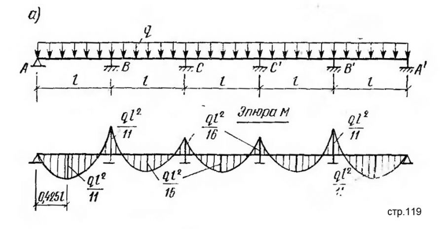 А ещё наглядней общий случай, приведён Генадичем на верхнем рисунке. Видите, над каждой опорой растянуты верхние волокна - изгибающие моменты изображены сверху. А в пролётах растянуты нижние волокна - моменты изображены снизу. Имеются нулевые точки моментов в местах перехода изгиба верхних волокон в нижние. В этих точках изгиб балки вообще отсутсвует.