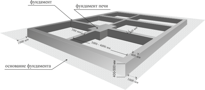 Фундамент печи просто обязан быть единым целым с лентой фундамента. Обратите внимание на картинку. Фундамент находится приблизительно в центре дома. Соединен перекрестьем внутренних лент с наружной, несущей лентой.
