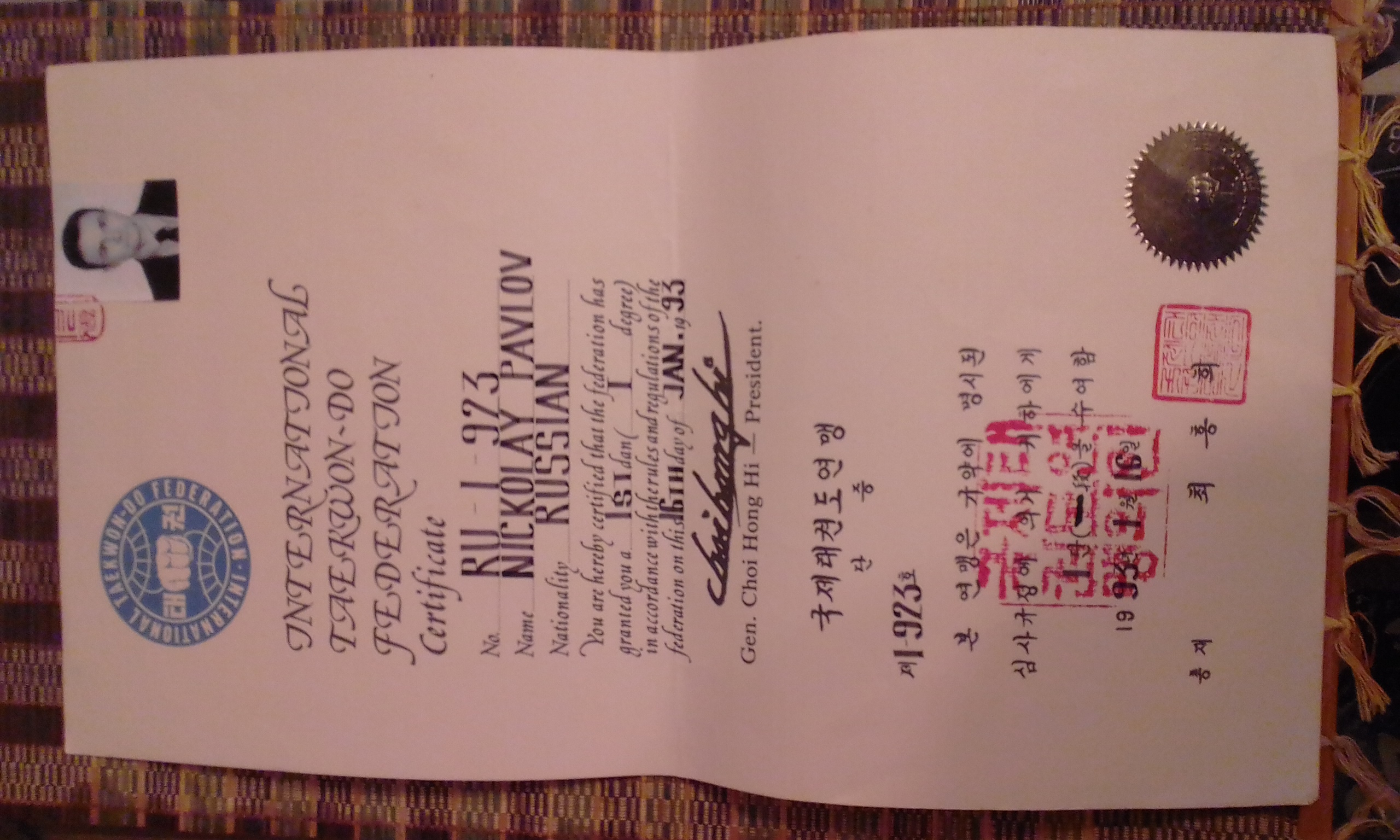 Это мой сертификат на первый дан черного пояса по таэквон-до. На настоящей рисовой бумаге!