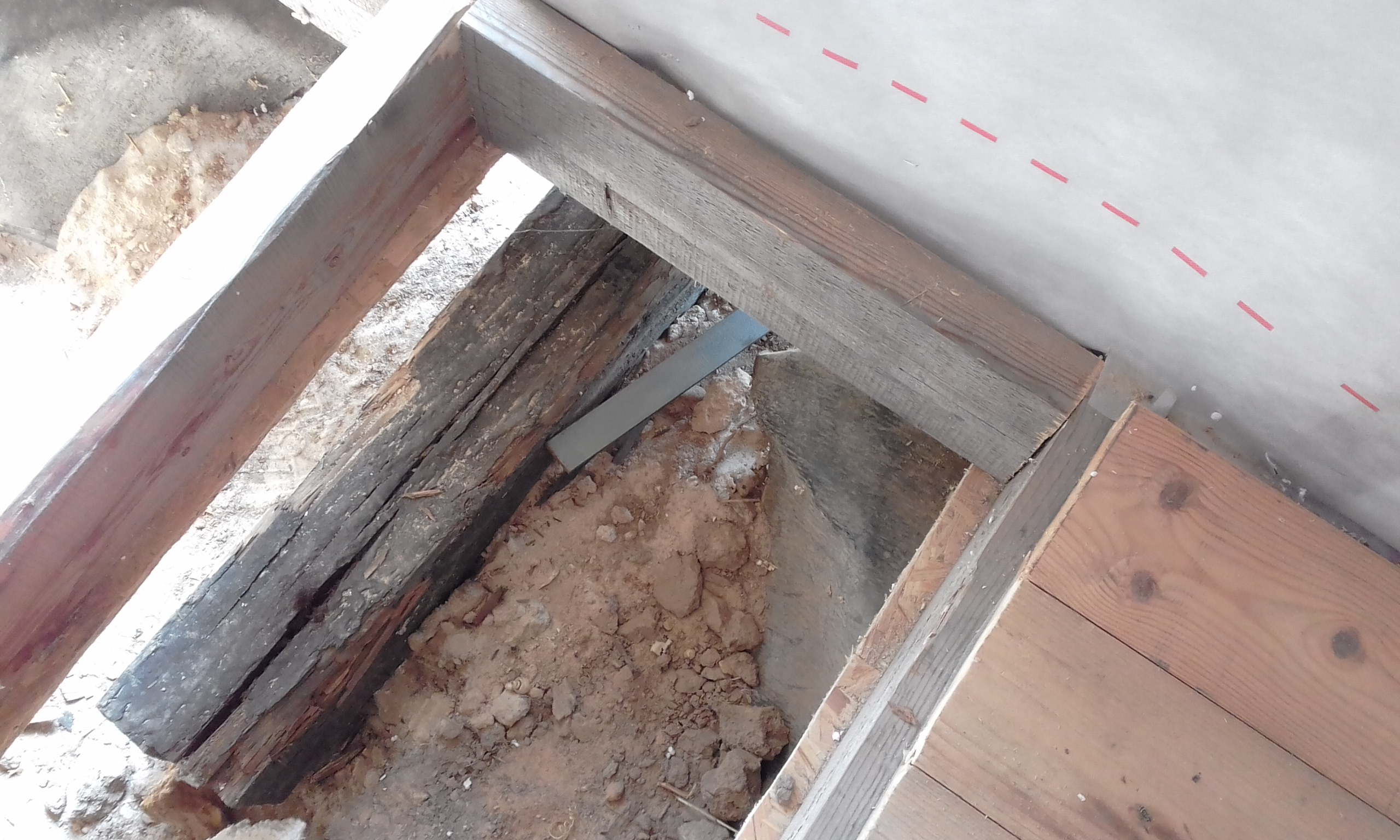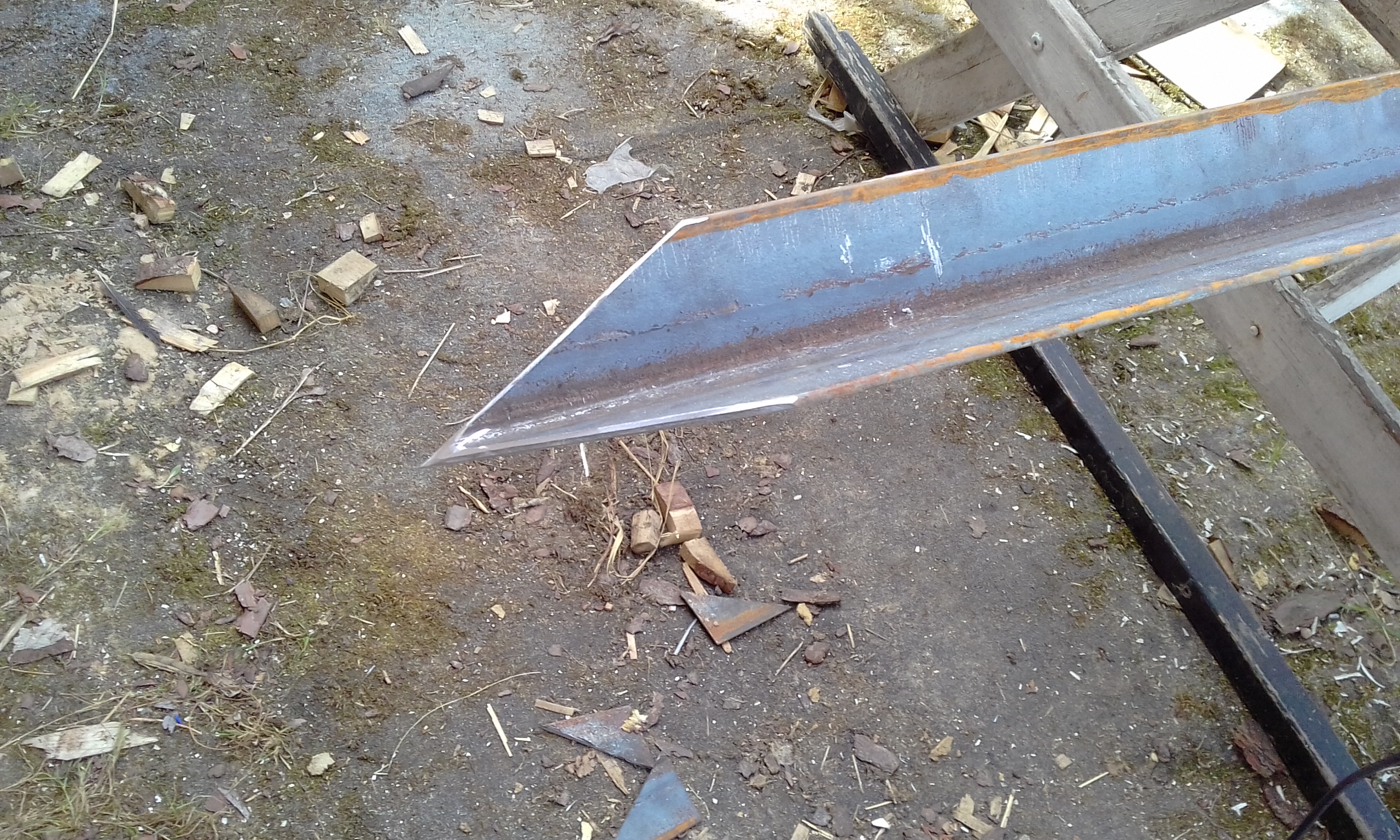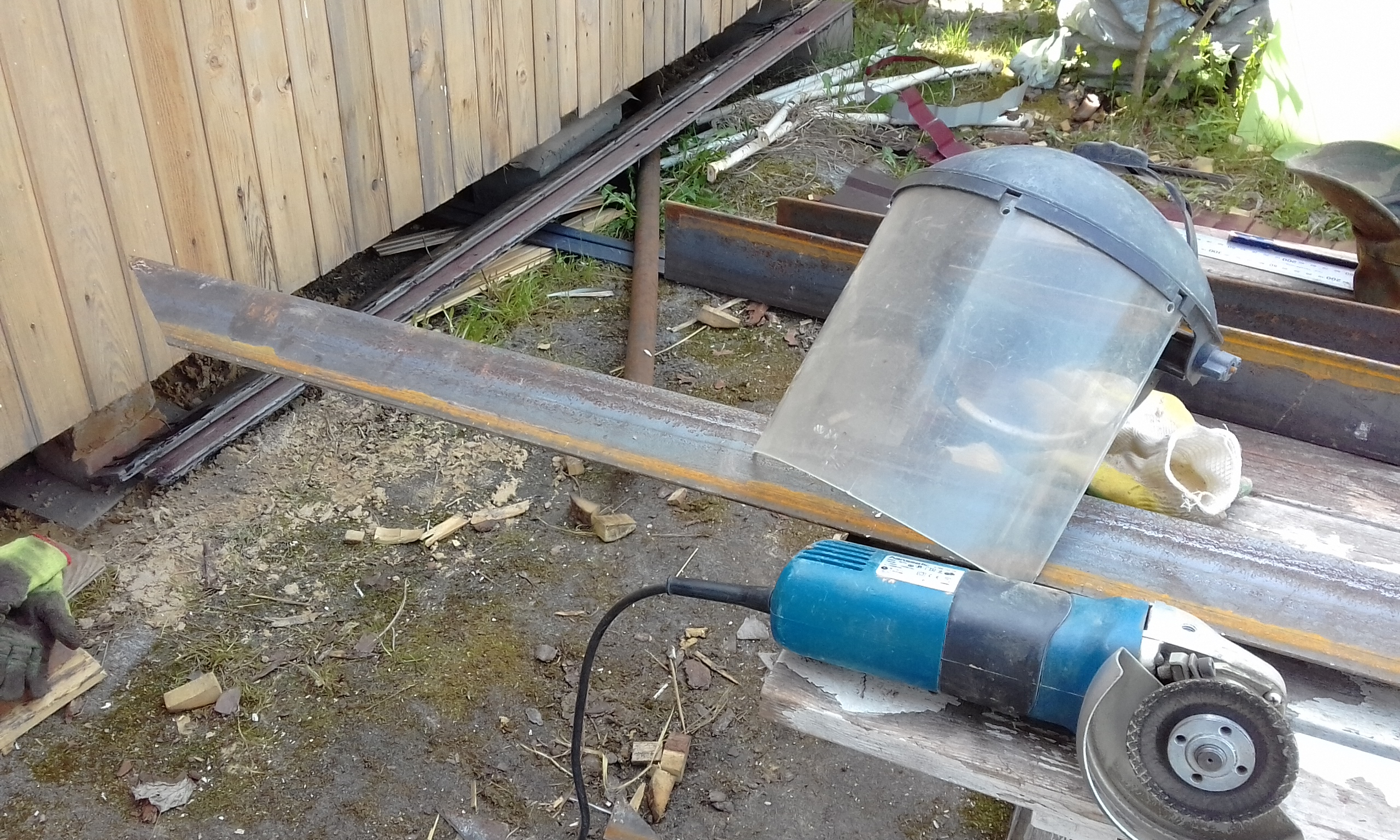 Здесь в подполье на нижней обвязке будет расположена главная шина заземления. Уложил полосу от главной шины заземления до первого электрода. Получилось расстояние от стены до электрода 2,6 м. С помощью болгарки обрезал на конус и заточил конец первого электрода, чтобы лучше входил в землю. Электрод вгонял небольшой кувалдой. Дело шло туго. Решил купить кувалду максимально тяжёлую и с длинной ручкой. Второй электрод обрезал поострей, но это существенно на производительность процесса забивания не повлияло.