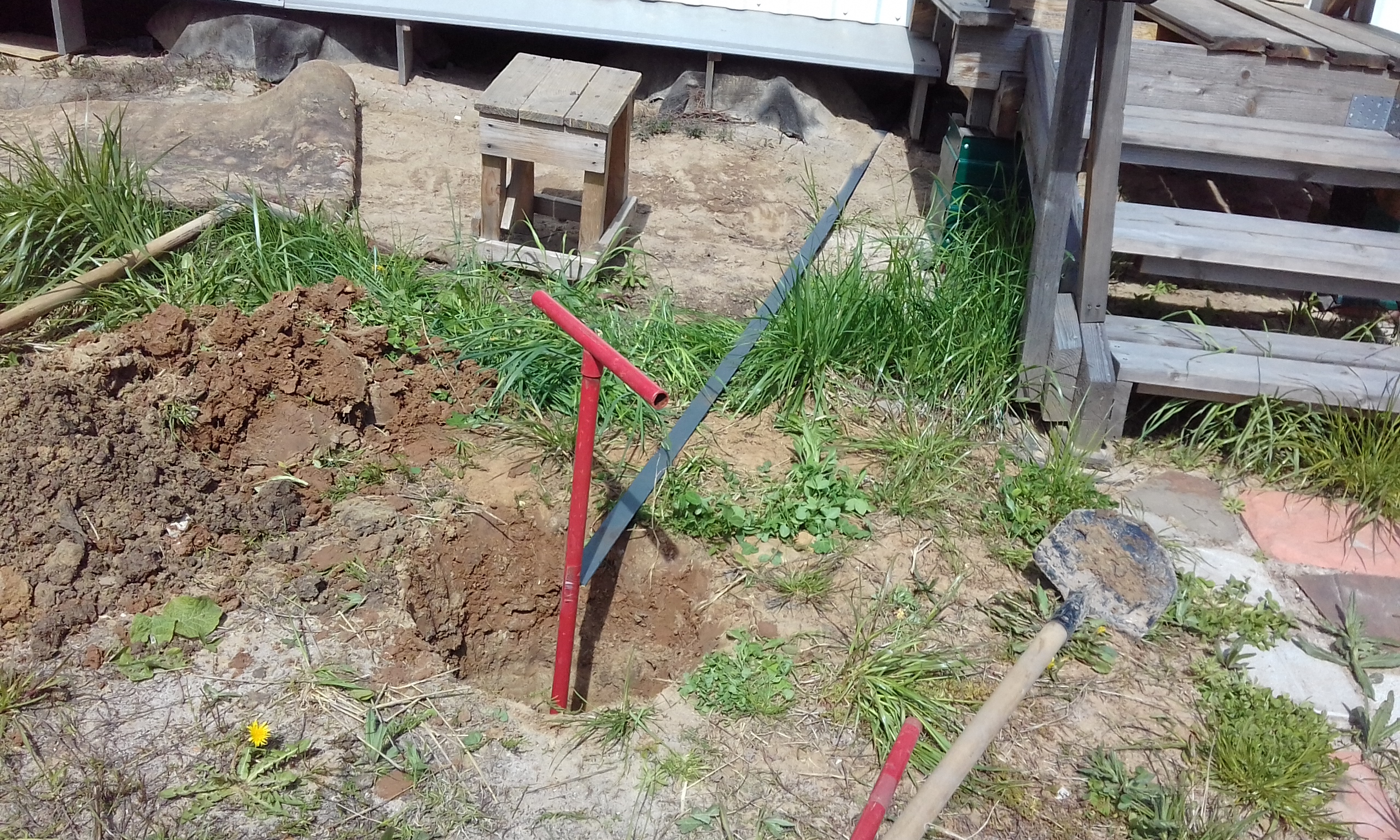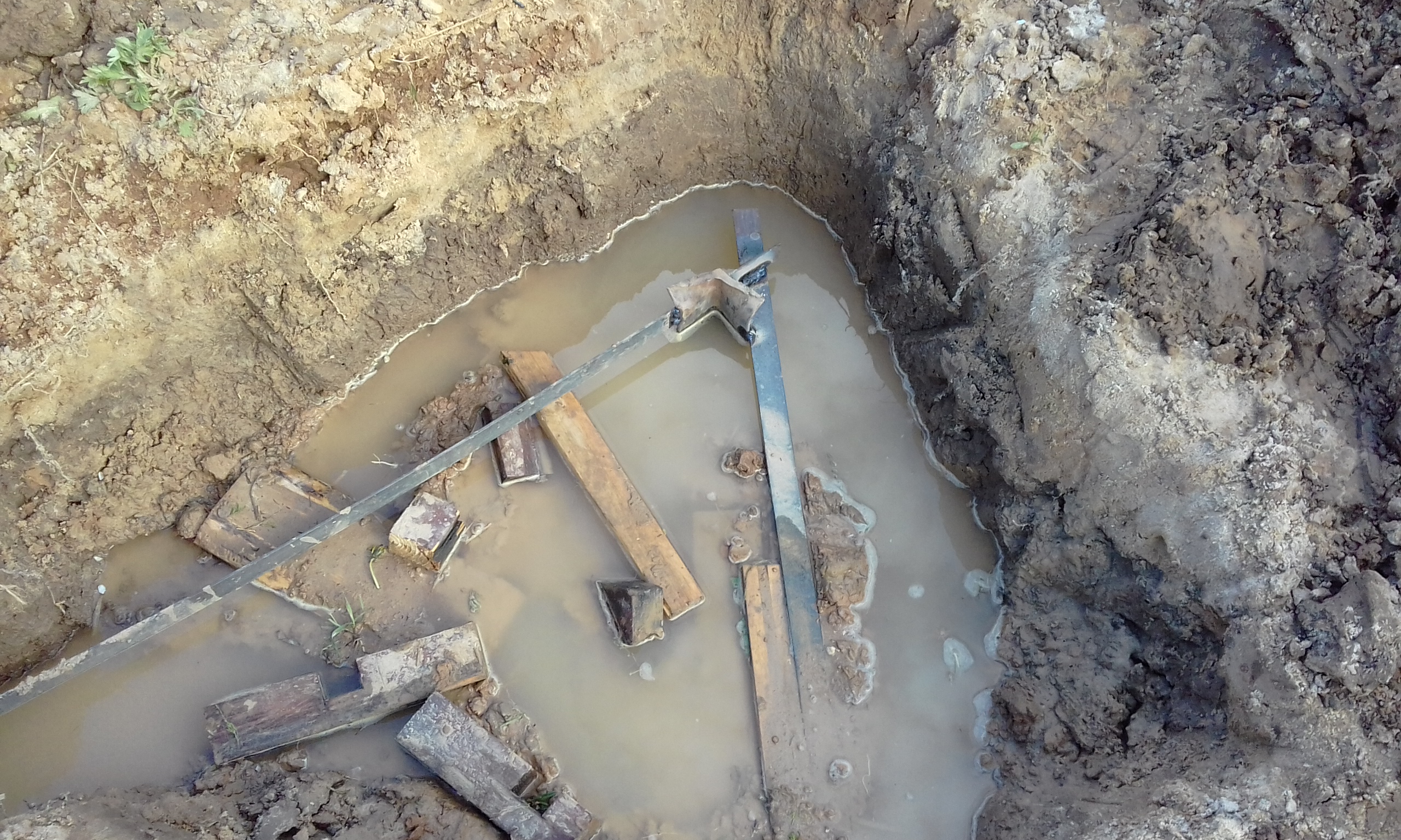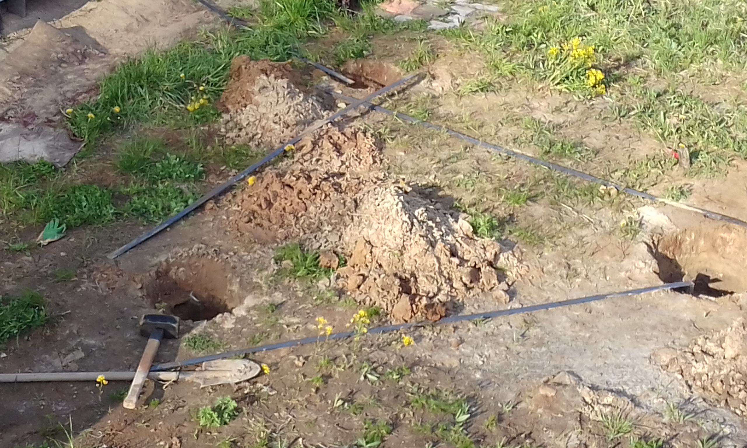 При бурении лидерной шахты верховодка появилась на глубине 80 см. Летом она уйдёт. Сейчас в колодце вода стоит на 30 см ниже поверхности земли, а летом будет на отметке - 5 м. Забил насколько получилось второй электрод. Контур треугольника заземления.